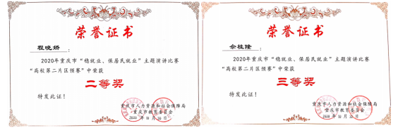 2.10月,我校程晓娇、佘桂隆获得2020年市教委、市人力社保局共同举办的“稳就业、保居民就业”主题演讲比赛(高校第二赛区)二等奖、三等奖。