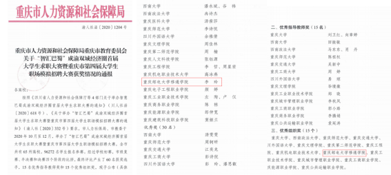 5.12月,在成渝两地教育系统、人社系统共同组织的“智慧巴蜀”成渝双城经济圈首届大学生求职大赛暨重庆市第四届大学生职场模拟招聘大赛中,我校淬炼商学院2018级李玲获得三等奖,学校获得优秀组织奖。