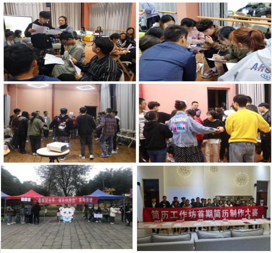 开展了第七届学生就业创业联合会成立大会暨第六届学生就业创业联合会表彰大会,老师见面会,干部集体夜跑,破冰活动,赴合川信息安全产业园参观学习,趣味运动会,简历制作大赛、面试技巧大赛、迎新晚会、月度总结表彰大会和“青苗.计划”课程培训。