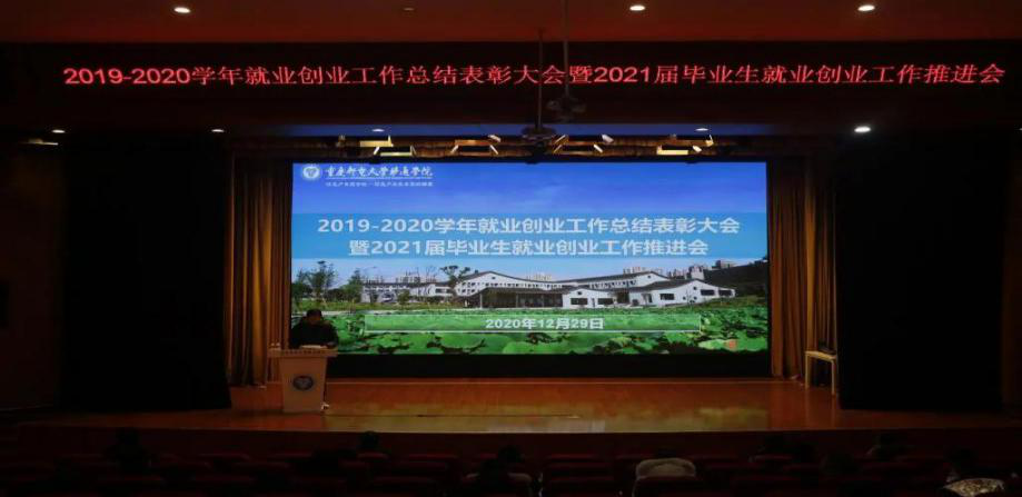 4.12月29日,在我校下里巴人剧场隆重举行2019-2020学年就业创业工作总结表彰大会暨2021届毕业生就业创业工作推进会。学校就业创业工作领导小组组长、校长张德民教授,学校就业创业工作领导小组副组长、校长助理周伟、刘枚、孙玺,学校就业创业工作领导小组成员、学校就业创业工作办公室成员、就业创业工作网格成员单位代表、全体辅导员、就创中心科员参与了本次会议。本次会议由校长助理周伟主持。