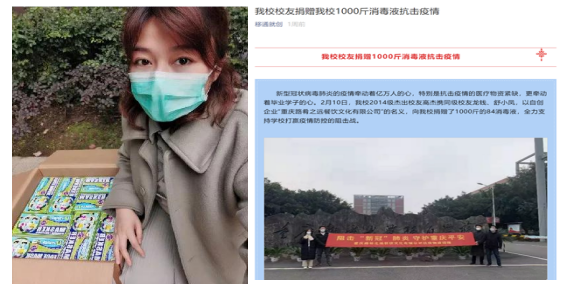 2014级校友高杰携同级校友龙钱、舒小凤,以自创企业“重庆路肴之远餐饮文化有限公司”的名义,向我校捐赠了1000斤的84消毒液,2007级校友杜鹃依托公司在东南亚积累的渠道,很快联系上一家印尼的口罩厂,但由于是防疫物资,在清关报关、物流运输等许多环节都面临着非常多的问题,捐赠1000个口罩,全力支持学校打赢疫情防控的阻击战。