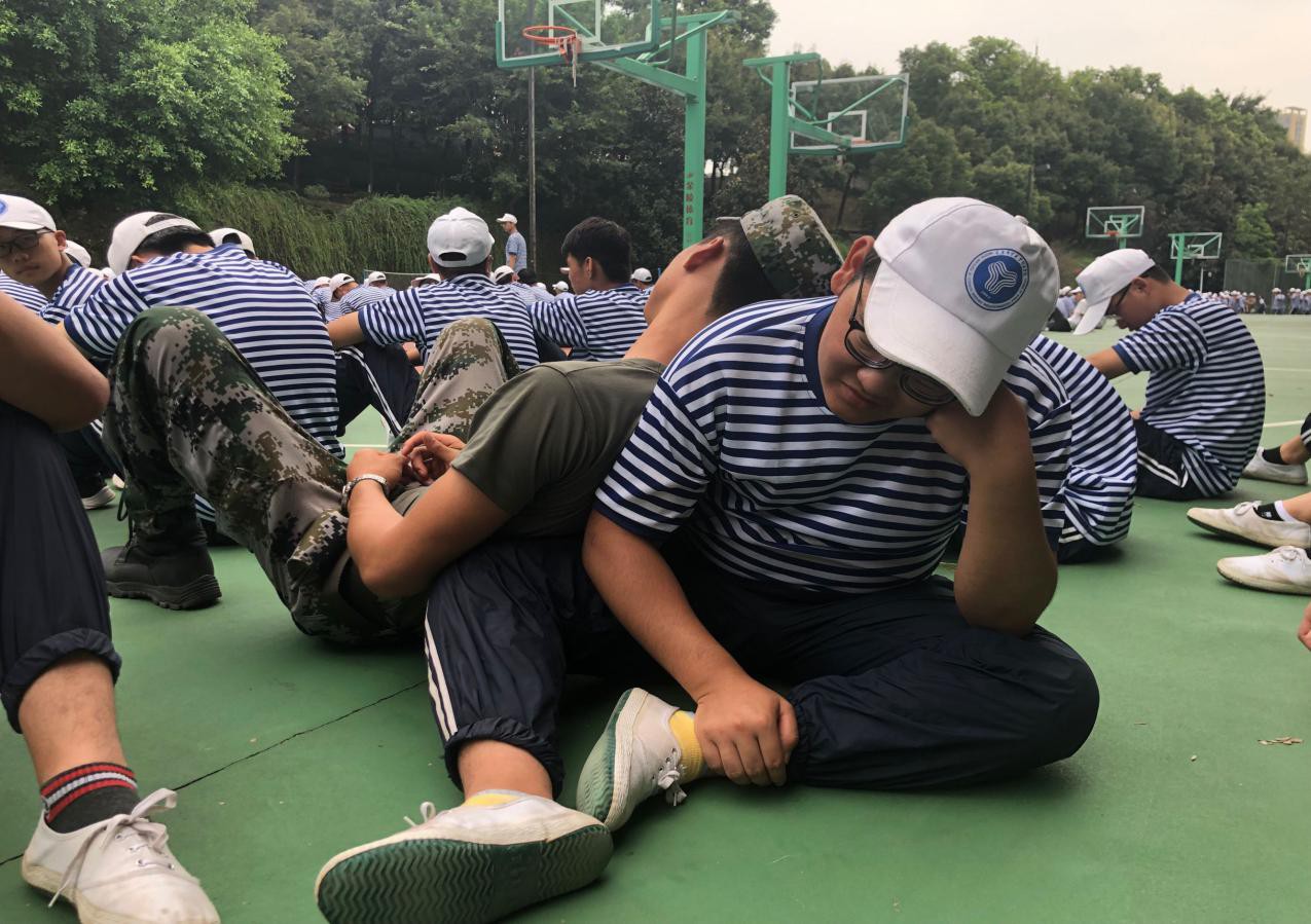 同学们在休息时嬉戏谈笑。军训虽然辛苦,但也是值得的,因为会结交许多不同的朋友。