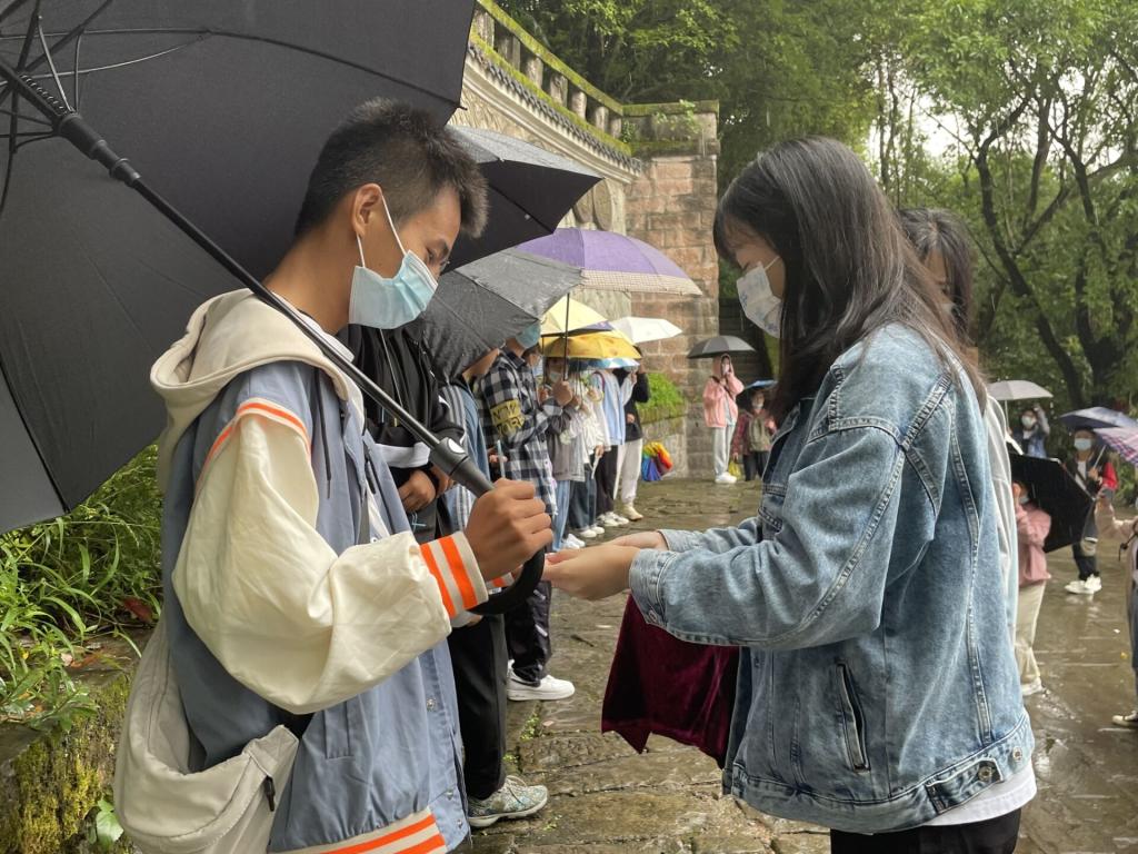 钓鱼城是本次远足的终点,但也是廊桥学生团队的起点,天空中的雨比出发时更甚,但到达终点的每个人却依旧热情饱满,在主持人的主持下,各个团队长为参与了远足的每位小伙伴颁发了廊桥人的身份象征——廊桥徽章,戴上徽章就是一名合格廊桥人。