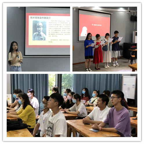 本次活动的主要形式是观看红色 电影《红星照耀中国》的精彩片段并作感想交流。严倩倩老师首先对该影片做了一个简单的介绍:这部电影取材于美国作家埃德加·斯诺的《红星照耀中国》这本书,埃德加··斯诺作为一名新闻工作者,为了弄清楚中国革命和战争问题,在1936年6月至10月,深入西北革命根据地并由此深入了解了中国共产党,认识了中国共产党的领导集体,深刻地领略到了先进政党的革命力量。随后,师生们怀着激动的心情一同观看了电影的精彩片段。每一个片段结束后,严老师和梅老师都对该片段的历史人物和背景进行了详细的解析,精彩的情节配上深刻的讲解,这部电影给每一位在场的同学都带来了深深的触动。