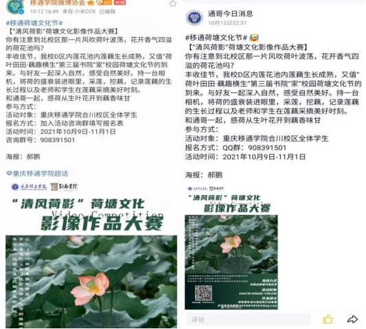 又至丰收佳节,重庆移通学院D区莲花池的莲藕已经成熟,“荷叶田田·藕趣横生”第三届书院“家”校园荷塘文化节也如期举行,由微博协会、别都书院、宣传新闻中心官方新媒体工作室共同主办的“清风荷影”荷塘文化影像大赛随之拉开序幕。本次活动以“荷叶田田·藕趣横生”第三届书院“家”校园荷塘文化节的拍摄为主题,分成摄影、视频剪辑两个比赛通道,于10月12日面向合川校区全体学生开展。活动内容主要围绕拍摄莲花出淤泥而不染的姿态、生机盎然的景象以及莲花凋零的画面,或是以师生挖藕采莲、烹饪共膳过程中各种美好瞬间为主进行拍摄记录,最后经主办方评选出优秀作品,并进行获奖展示。
