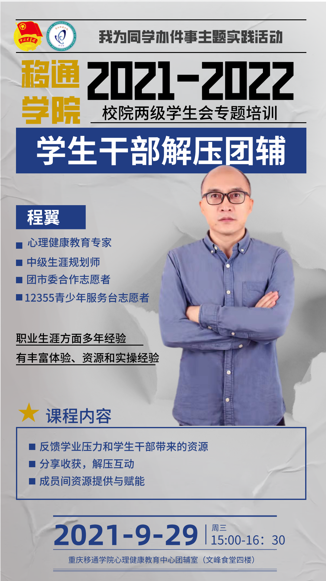 本次12355幸福大讲堂以“学生干部解压团辅”为主题,由心理健康教育专家、中级生涯规划师、团市委合作志愿者、12355青少年服务台志愿者程翼老师主讲,面向我校校院两级学生会学生干部。