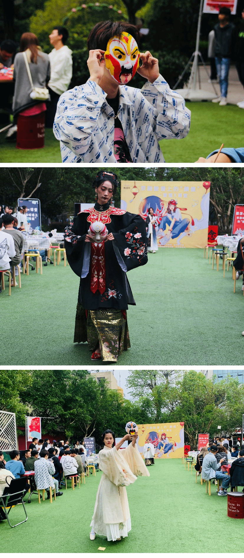 绘画结束后,创作的同学们也一一展示自己的绘画成果,不论是绘画风格还是设计理念充分体现出当代青年大学生勇于创新的性格,爱莲书院与思政部的各位在场老师以及同学们纷纷鉴赏风格迥异的脸谱作品,他们根据脸谱的完成程度、讲解内容、设计理念等环节做出评分,对他们心目中最喜欢的脸谱作品投出宝贵的一票。工作人员通过票数统计最终选出了获票数最高的几幅作品,此时汉服社的成员也早已迫不及待,他们穿着漂亮的汉服为票数较高的十一幅脸谱作品进行展示走秀,配合他们的服饰和精致的妆容,一幅幅新颖的作品以独特的形式映入眼帘,给在场的同学们留下了深刻的印象。