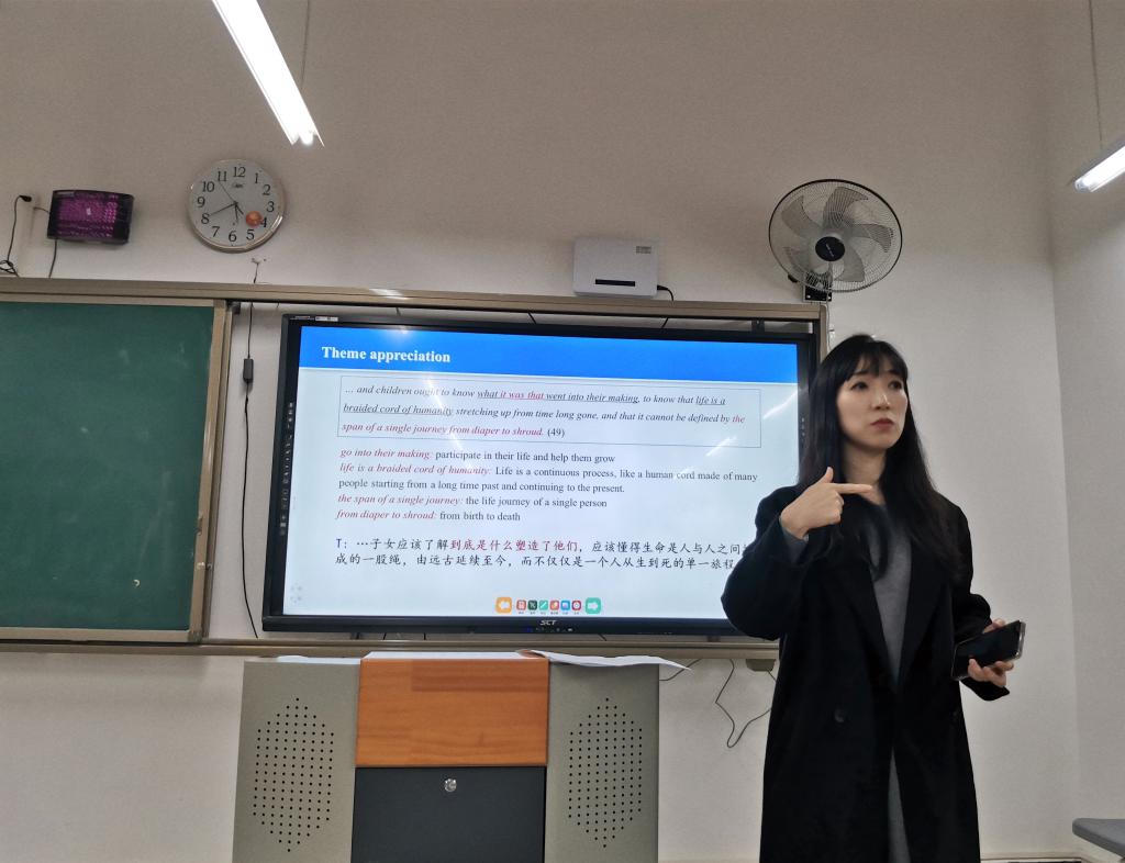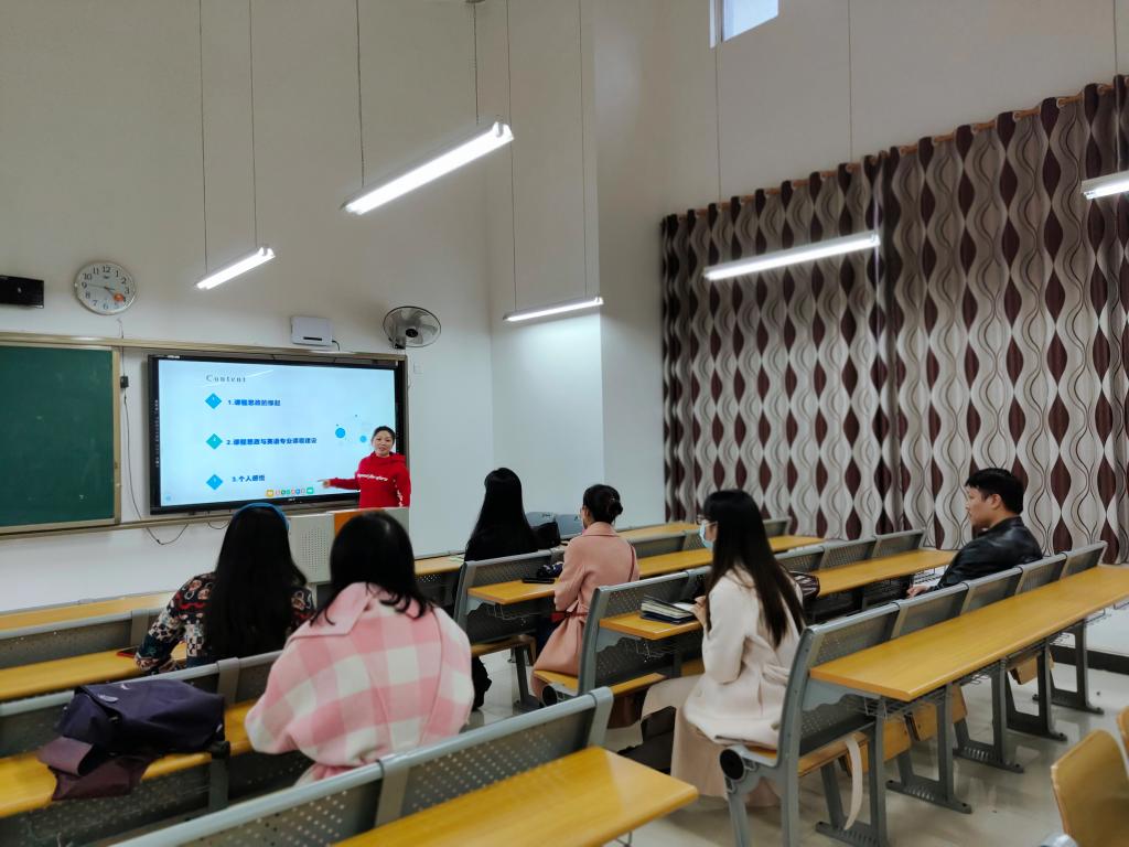 魏铃老师分别从“高校为什么要开展课程思政”和“英语专业课程为什么要融入思政元素”两方面分享了此次培训的“所学、所悟”。她指出,作为一名英语专业教师,在传授专业知识的同时,还要让学生自觉坚定文化自信,坚持中华文化的主体性,坚守中国文化的话语权。因而,在专业课教学内容整合、教学话动设计等方面要狠下功夫,充分挖掘思政元素,努力实现教师与学生的同频共振。