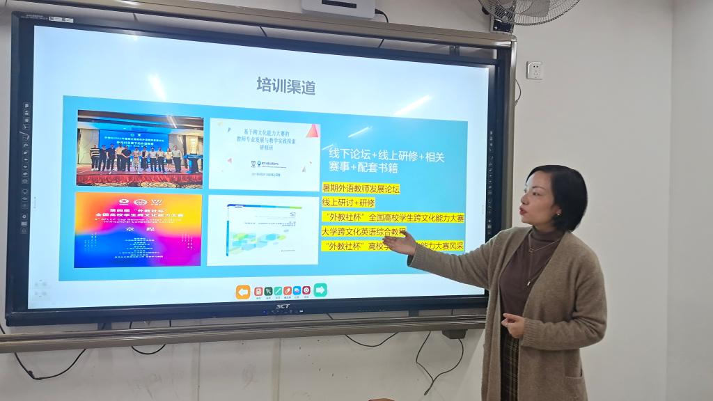 甘伶俐老师分别从时代背景、策略研究、培训渠道三个方面分享了主题为“落实思政教学,培养新时代跨文化人才”的参会心得,其中重点提到了提高学生跨文化能力对推进我国深入参与国际事务、促进世界文化交流的重要意义,并提出了从专业内涵拓展、教学体系更新、多维能力和教学方式融合等方面实施课程思政、培养新时代跨文化人才的建议。