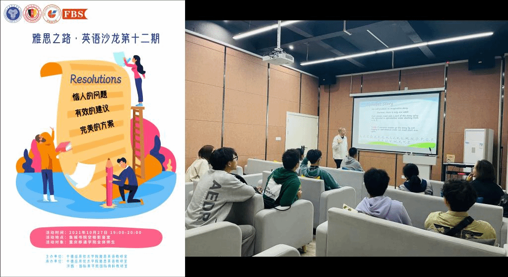 期中渐至,伴随时间流逝而来的有酸辣,有咸甜,这是生活点滴的调味品,在课业、亲情、友情、爱情中总是不乏成长的烦恼,移通学子们能否得心应手?以此为契机,中德应用技术学院雅思英语教研室携手淬炼商学院·国际商学院国际商科教研室开展雅思之路·英语沙龙第十二期。近期,在鱼城书院空格影音室成功开展“Resolutions”为主题的沙龙活动,外教Peter主持,雅思教师、国际商科教师、优秀学生代表参与。