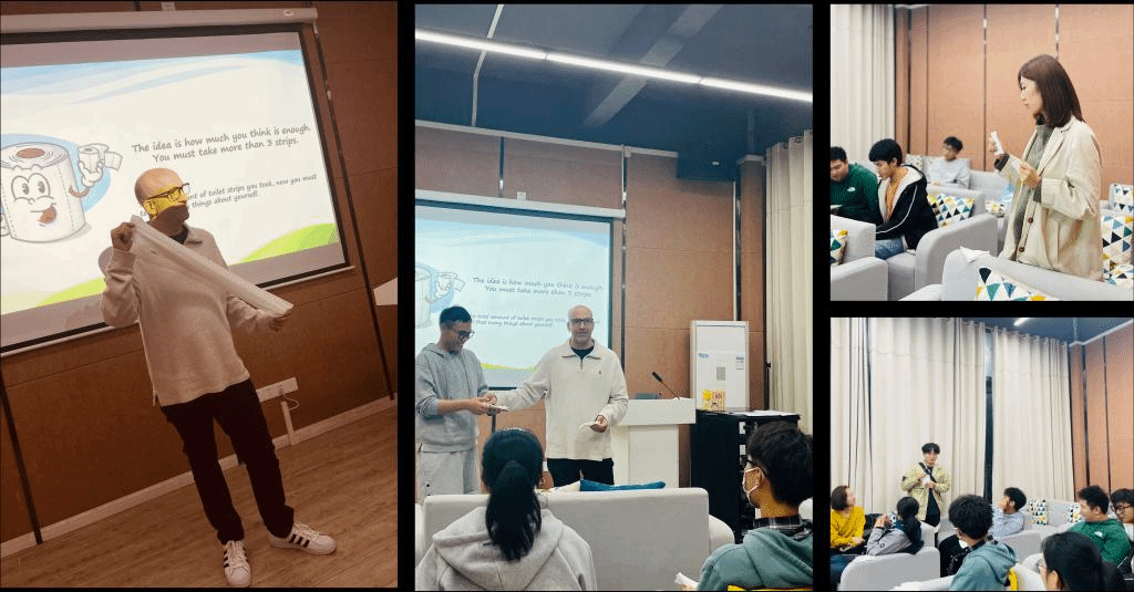 破冰游戏后外教另辟蹊径,用一卷纸巾向师生展示“未雨绸缪,时刻准备”的思想态度,并用一段激励人心的演讲鼓励同学们要有迎难而上的精神和解决问题的信心,气氛变得热烈起来。