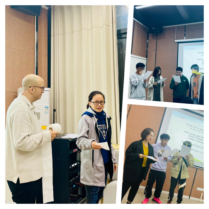 小组讨论环节把活动推向高潮。每组成员讨论生活中常出现的问题,给出解决方案并进行集体分享,问题涵盖友情爱情冲突比如最好的朋友和男/女朋友,亲情和自我冲突,友情和自我冲突等。每一组的分享,外教都会一一反馈,并不断引导同学们化繁为简,找出矛盾症结,同时也要化简为繁,为简单事件或现象赋予其更深远的意义。