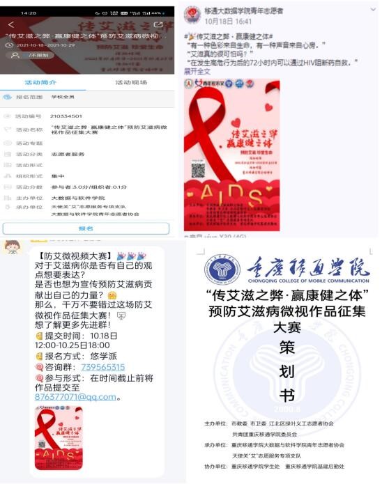 “艾”若在你我,请注意防护;爱若在你我,请伸出援手。10月18日,大数据与软件学院志愿者们通过官方微博、微信公众号、抖音、QQ说说以及各年级群等多渠道进行活动宣传。本次活动采取线上提交微视作品的形式开展,选手可个人或团队形式进行参赛。通过拍摄以防艾为主题的相关视频进一步提高同学们对艾滋病的认识,让同学们更直观、形象化地感受到艾滋病带来的巨大危害,时刻警惕,远离艾滋,树立“青春要爱不要艾”的意识。