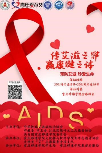 “一路上,不管跌跌撞撞;梦的光,永远闪耀在我的心上……”《瞳孔里的太阳》是世界艾滋病推广歌曲,唱出的是艾滋病患者的心声。为了加深师生对艾滋病的了解,让更多人正确认识并正视艾滋病。10月18日至11月5日,由市教委、市卫委、江北区绿叶义工志愿者协会、共青团重庆移通学院委员会主办,重庆移通学院大数据与软件青年志愿者协会、天使关“艾”志愿服务支队承办,重庆移通学院学生处、重庆移通学院基建后勤处协办“传艾滋之弊·赢康健之体”预防艾滋病线上微视作品征集大赛火热举行。