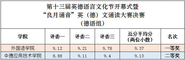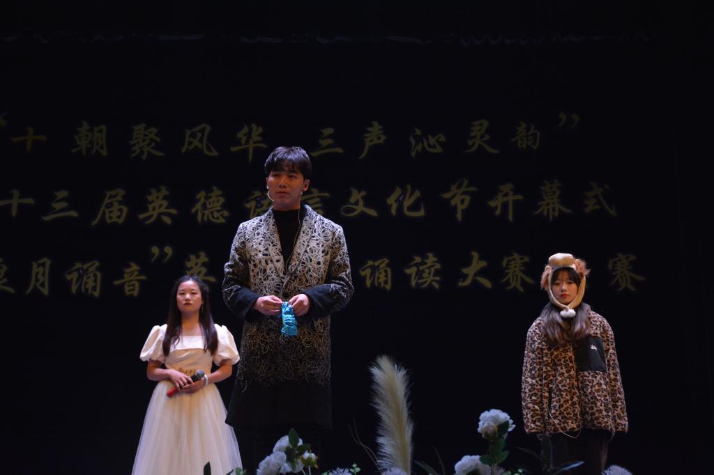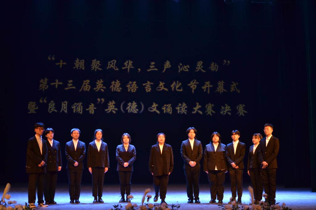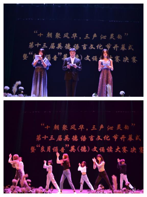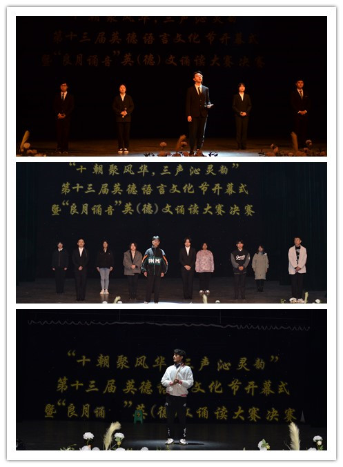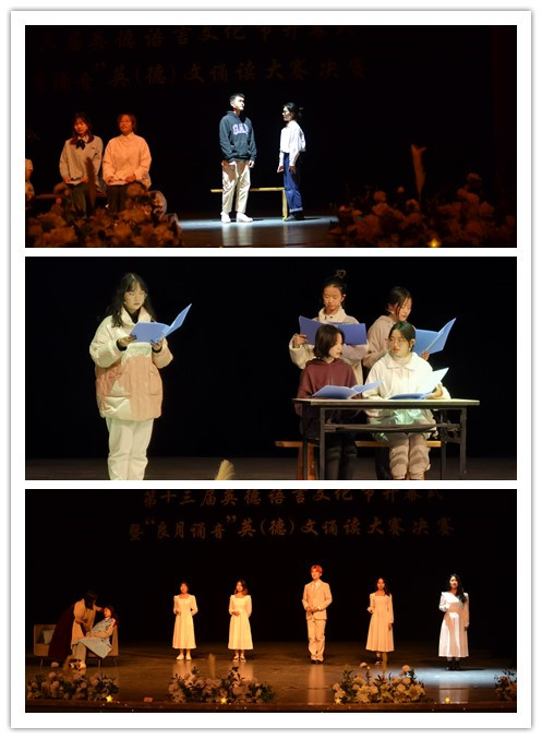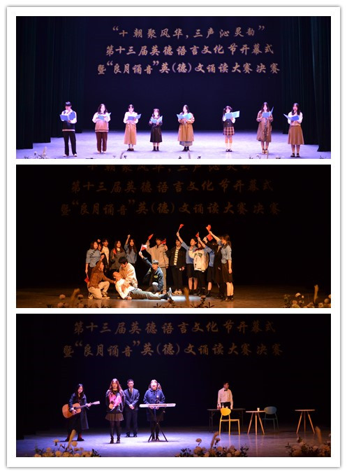 接下来轮到德语组选手登上舞台。外国语学院德语组的《手套》用动画视频展示、扎实的表演实力向观众展示他们的成果。中德应用技术学院带来《Sonett+NeueLiebe,neuesLeben》,用真实的情感触动着每一位评委的心弦。德语组选手的精彩演出把英德语言文化节所要表达的语言特色完美展现。