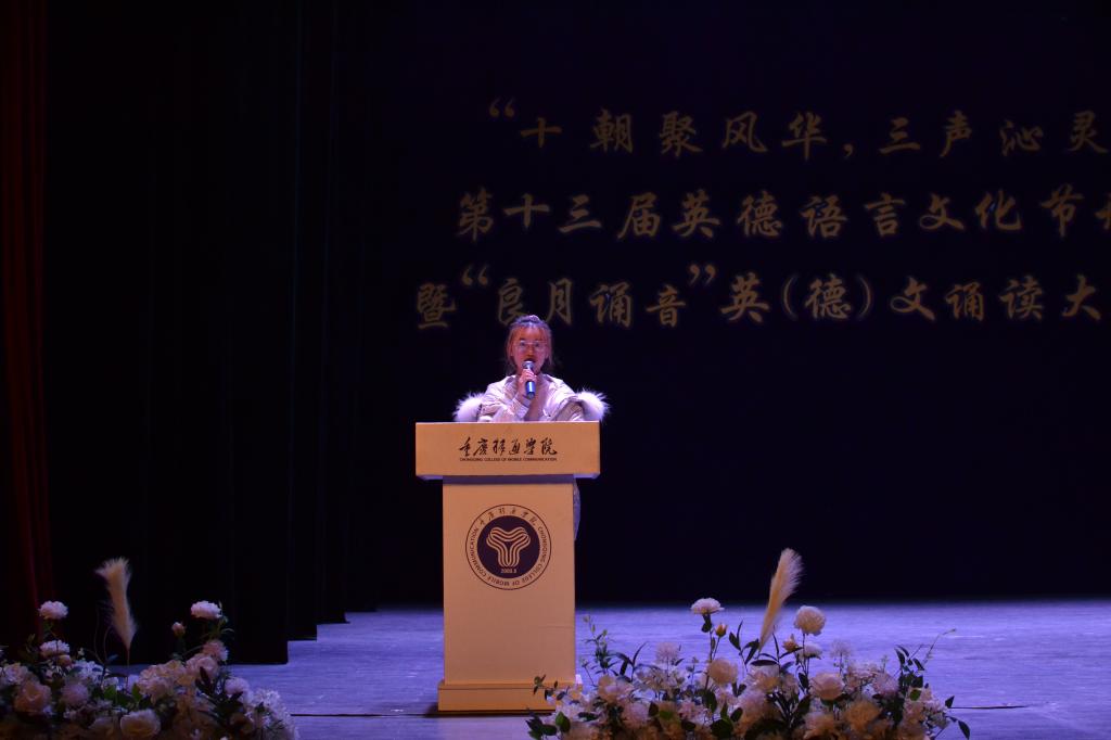 “此次活动的举办,不仅仅是对英德两种不同文化的学习,更是对学生能力的一种锻炼。”字字关切,寄予厚望。从吴世银院长的致辞中,我们能深刻感受到他对此次活动的关注和重视,不仅仅是把朗诵比赛完成,也要对一系列子活动加以重视。外国语学院三届三任学生会执行主席涂馨尹作为学生代表发言,分享她与英德语言文化节的故事,将在双校区范围内开展更多的英德语言文化节子活动。