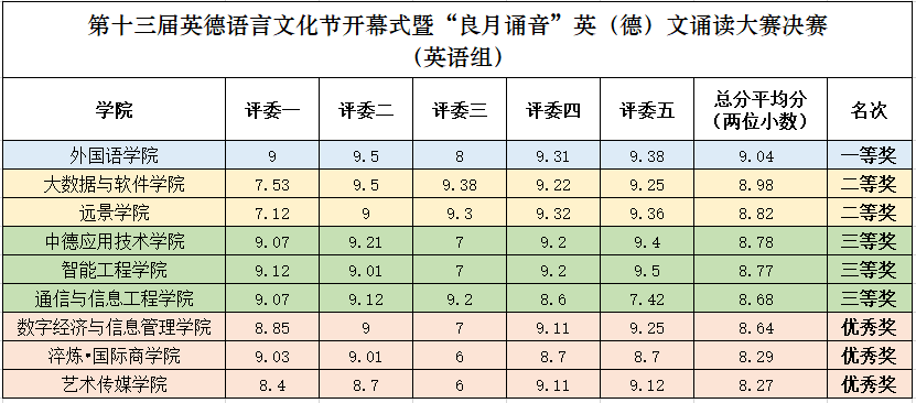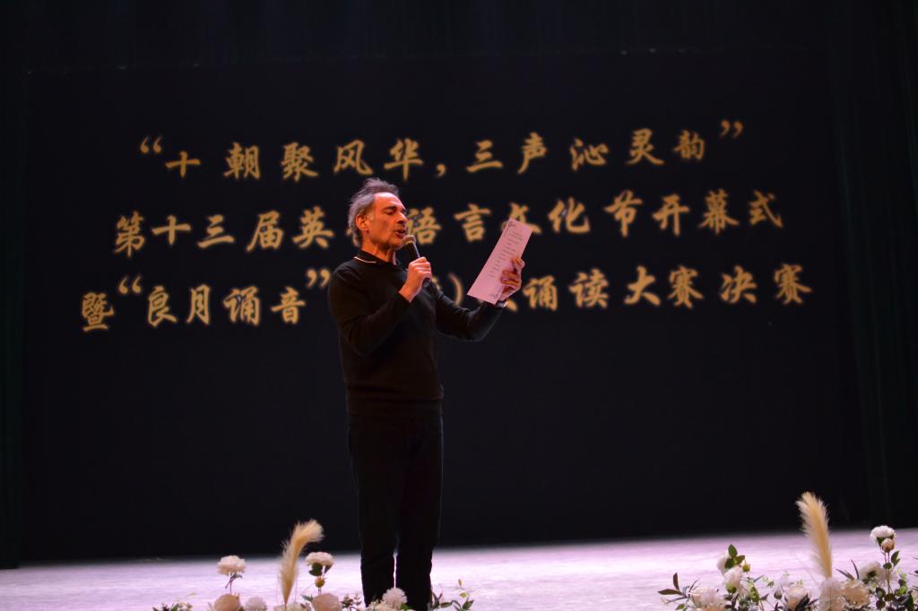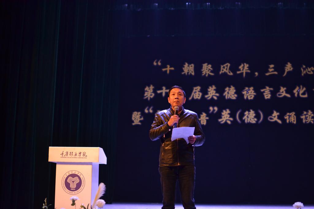 挥手作别秋,转眼遇见冬,冬日生机依旧在,朗朗诵读之声响彻校园。为提高同学们的诵读和语言表达能力,增强同学们的语言兴趣,特此外国语学院于2021年11月10日在缤果大剧院开展第十三届英德语言文化节开幕式暨“良月诵音”英(德)文诵读大赛决赛。到场评委有:外国语学院院长吴世银老师、外国语学院教学副院长罗琳老师、钓鱼城科幻学院陈捷老师、外教Clive、德语专业教研室主任熊光源老师、外教Elias、学生评委崔琪、张汪翔。