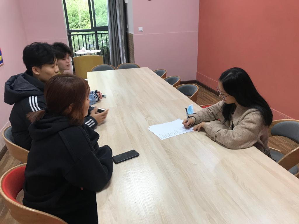 在交流中,张红老师总是先介绍本次交流的目的、意义及期待,以轻松愉悦的方式打开同学们第一次交流的尴尬,同时,认真记录各位同学的信息,为制作同学们的成长档案增加信息库资源。