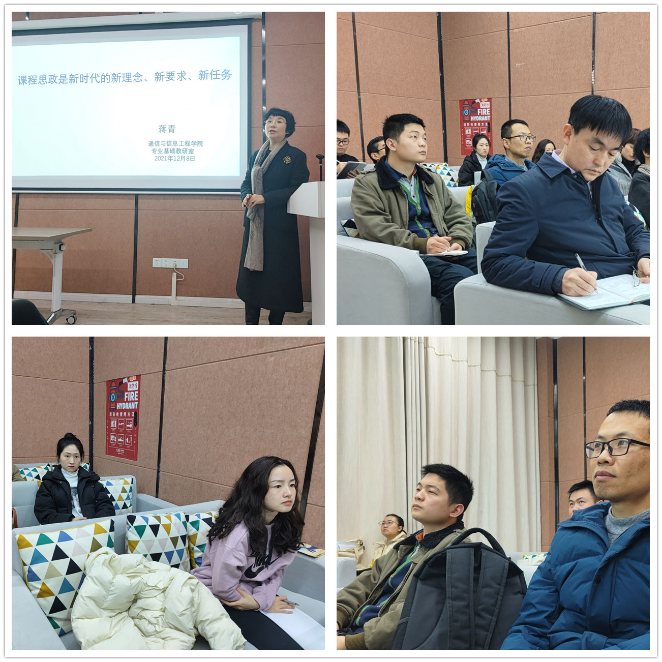 为把思想政治教育贯穿于整个人才培养体系,全面推动课程思政建设工作,12月8日下午,通信与信息工程学院专业基础教研室在鱼城书院空格影音室开展课程思政交流研讨会。会上蒋青老师和赵瑞玉老师分别做了课程思政专题讲座。此次会议由教研室主任席兵主持,教研室全体教师参加。