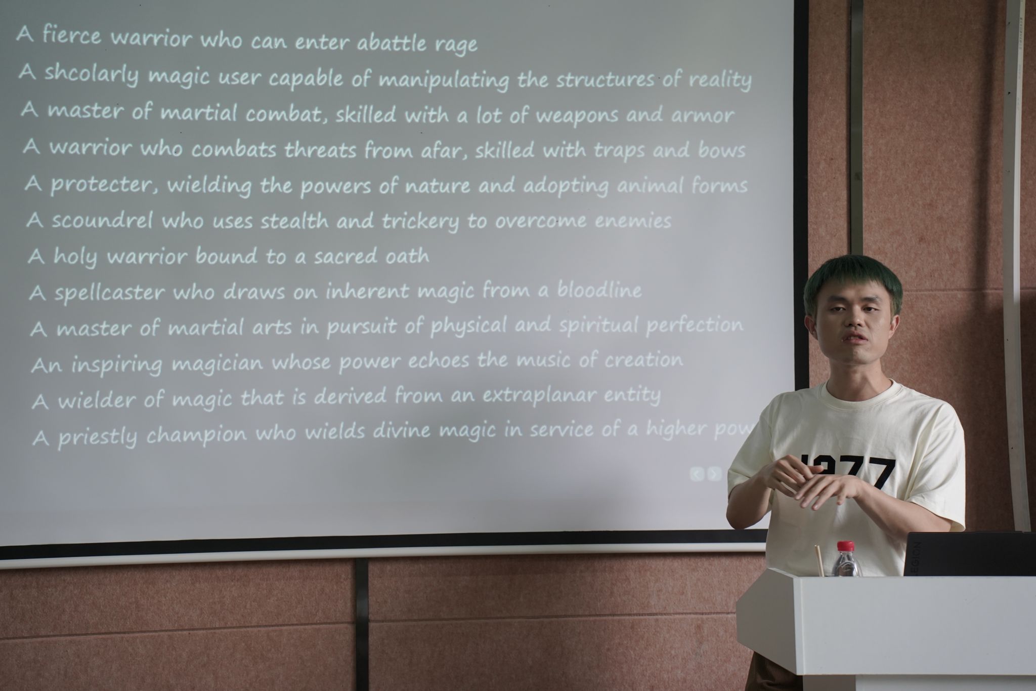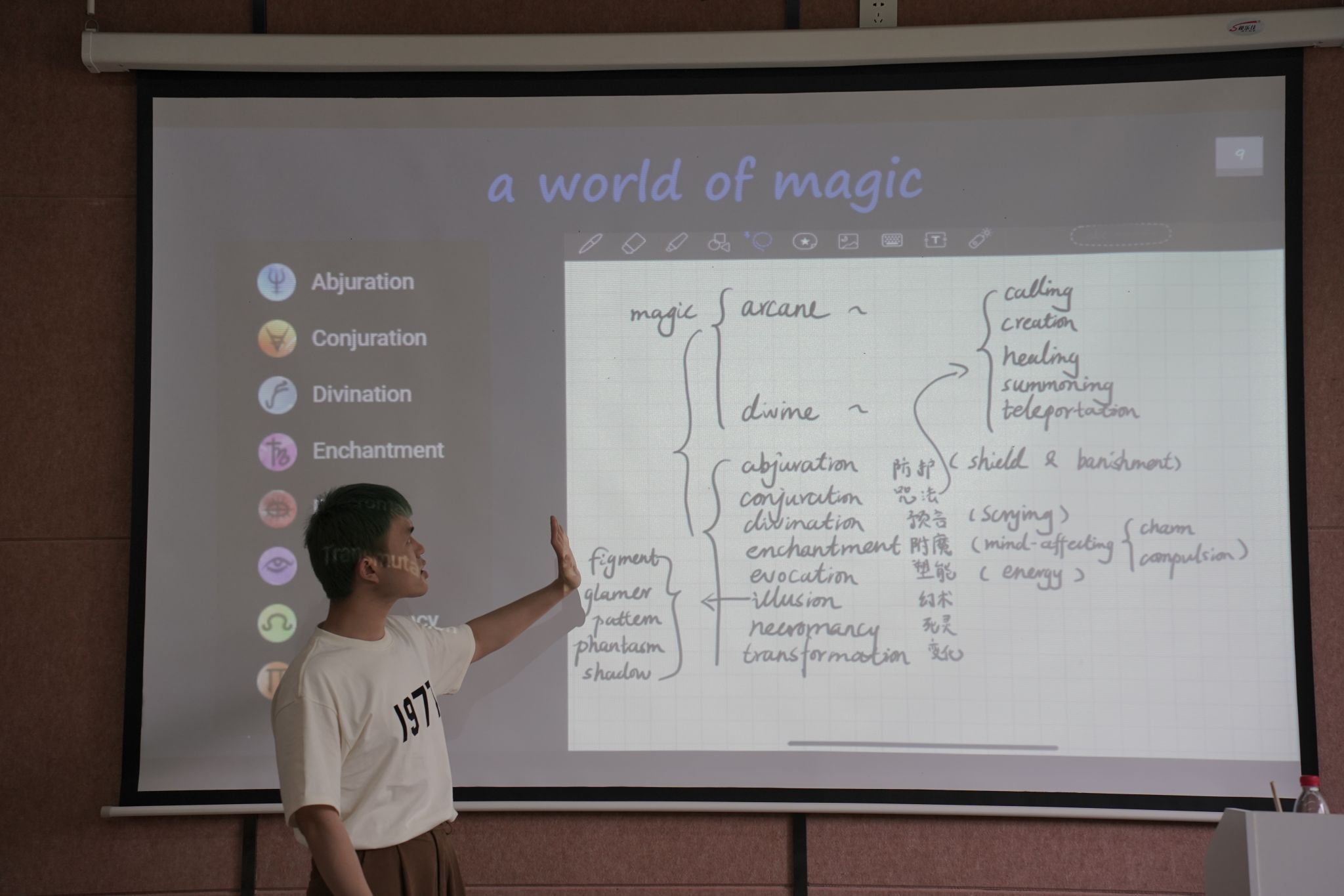 为帮助同学们更好的了解影片与DND之间的关系,区分游戏人物的职业和种族,何幸子老师以思维导图的方式进行了讲解。《龙与地下城:侠盗荣耀》是根据经典桌游《龙与地下城》(简称DND)改编的一部好莱坞真人电影,DND中的升级、经验值概念、生命值概念、职业概念、地下城概念、随机和概率概念等等,至今仍被很多游戏沿用。虽然现在已经是电子游戏的时代,但还是有这么一群人,喜欢传统桌游的“触摸感”和“仪式感”,而《龙与地下城:侠盗荣耀》,就是对这种情怀的一次致敬。