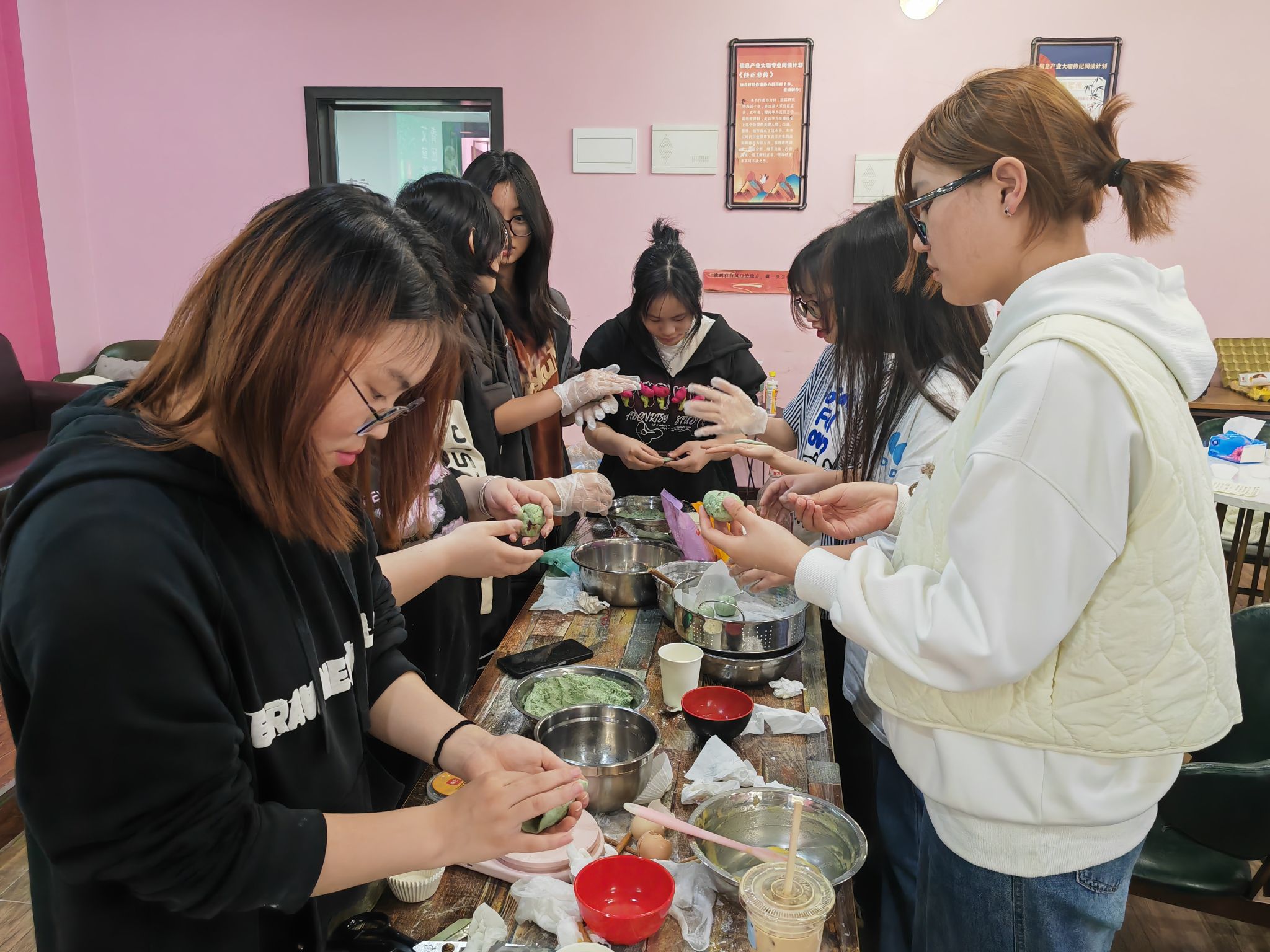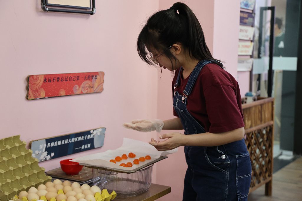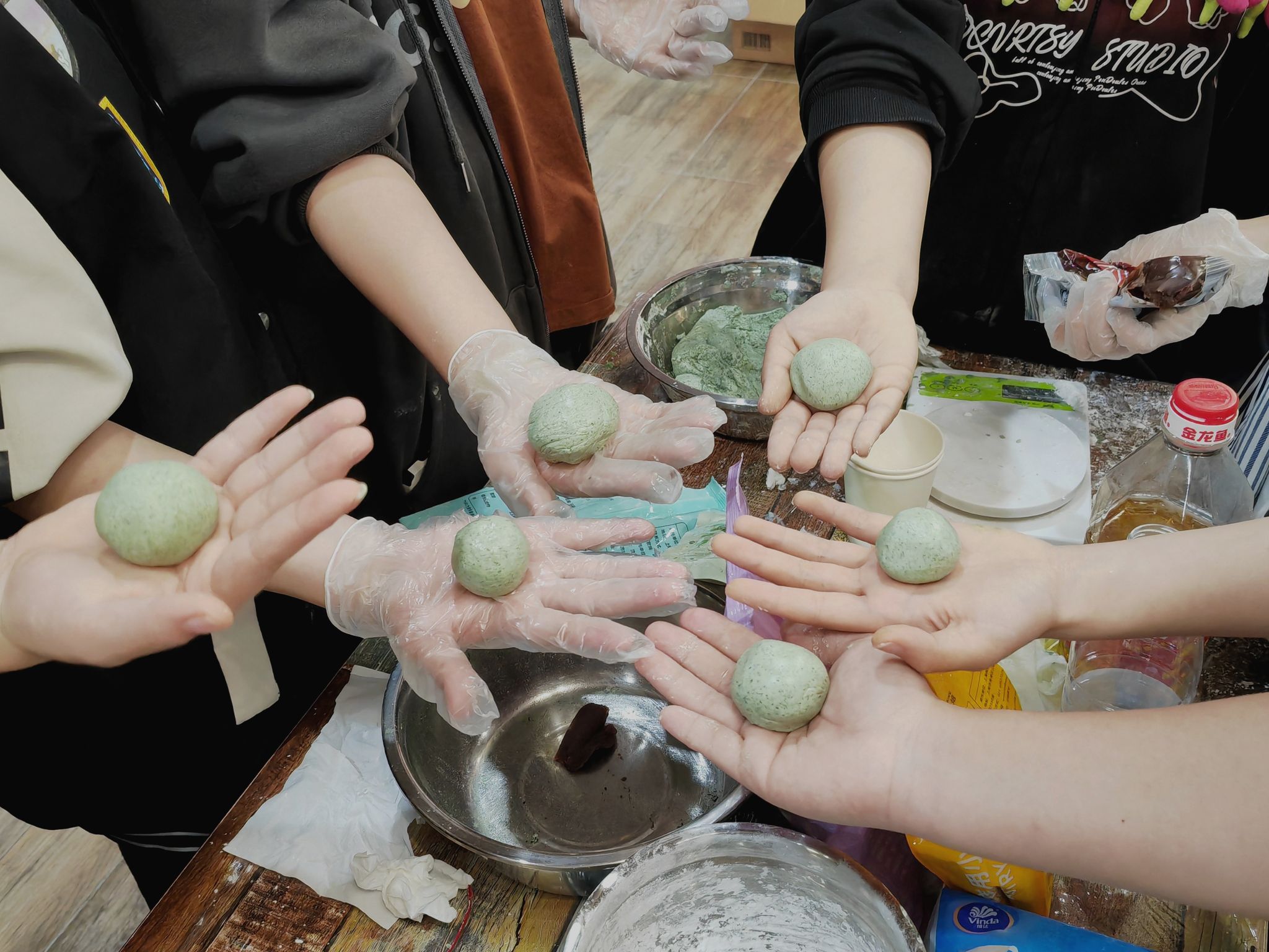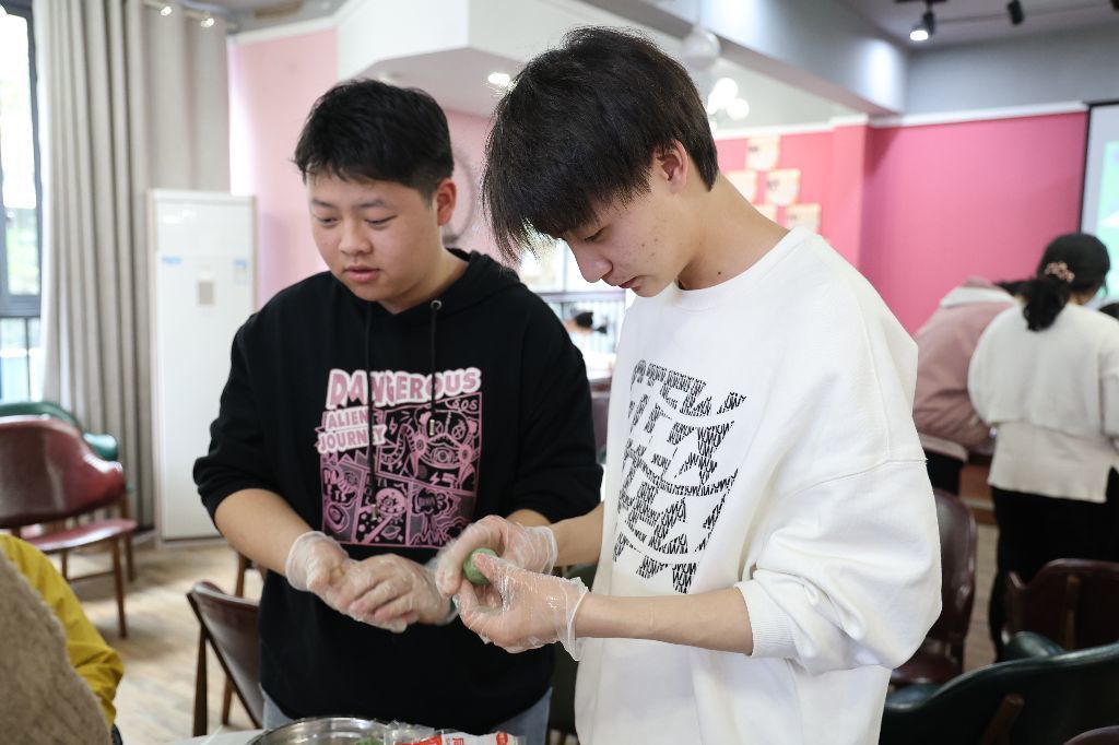 在制作青团形状时,部分同学也发挥自己的创意制作出了形态各异的外形。在包青团的时候,根据现场提供的馅料,同学们大开脑洞,奶油+咸蛋黄、巧克力+肉松、油辣子+芝士.....各种奇妙的搭配被包进青团里。一枚小小的青团,不过手掌之大,浓缩的却是同学们对中华传统节日的传承,大家在欢声笑语中沉浸式体会传统节日带来的乐趣,拉进了彼此之间的距离。