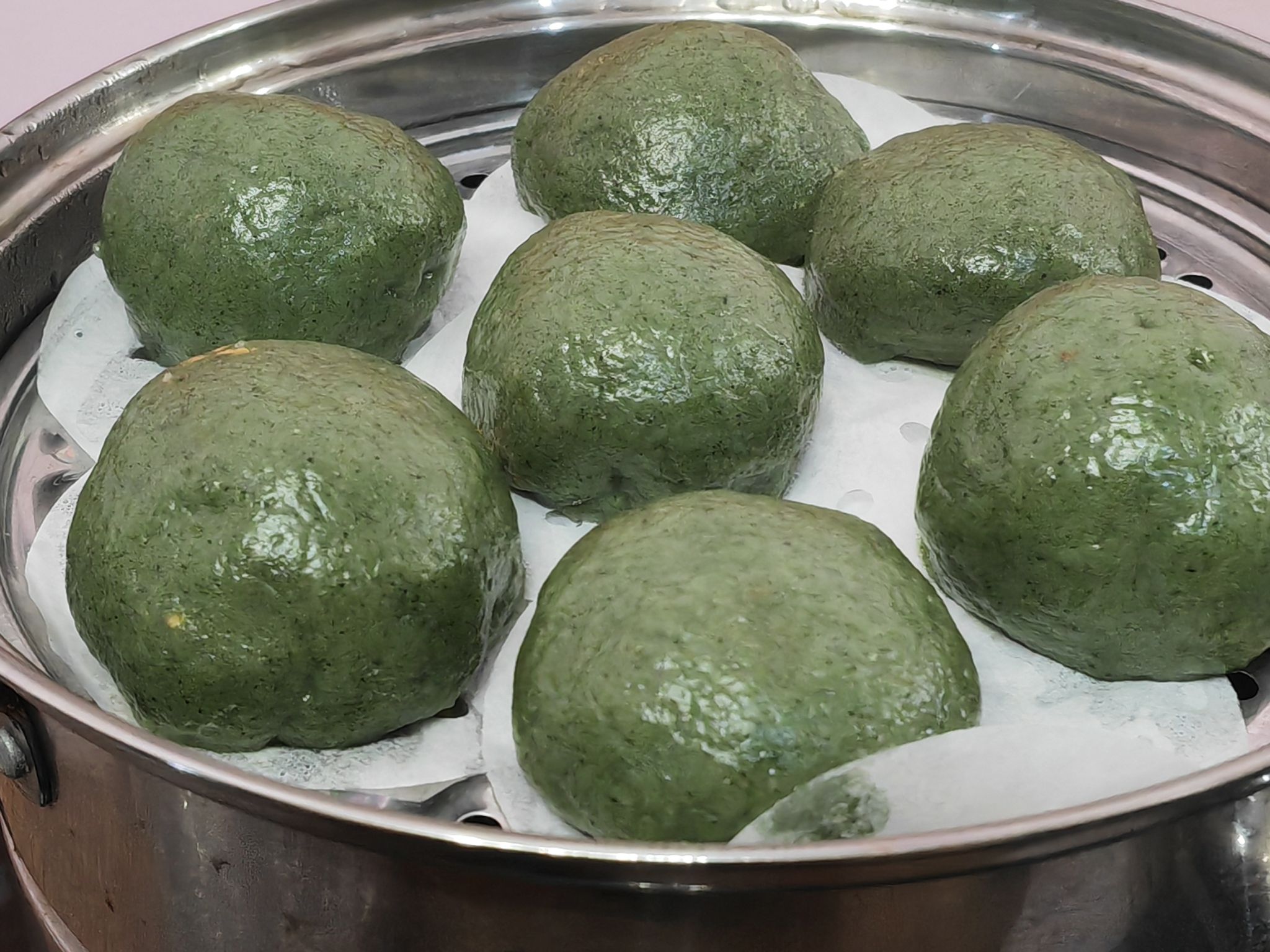 “碧玉团圆满屉香,素舂柔艾捣砧忙。”同学们给包完的青团刷上一层食用油摆入蒸锅,蒸熟出笼的青团更是色泽鲜绿,香气扑鼻。小小的团子,通体青翠,闻一闻清香扑鼻,细细品味,清淡香甜。大家一起品尝着自制的美味,咬一口自己的“果实”,满口都是“春天的味道”。古人怀着对幸福生活的美好向往,将美味包裹。今天我们怀着对传统的崇敬,将文化继承。