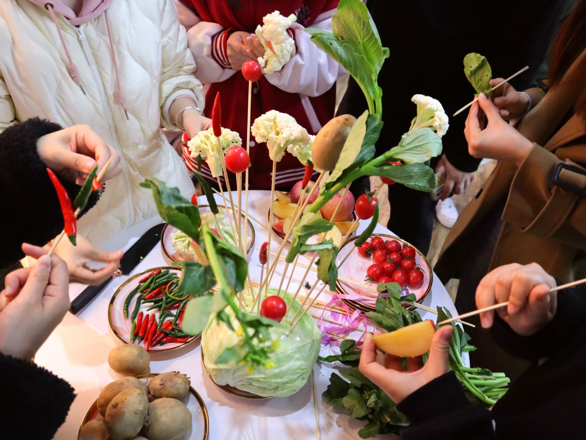 有人说,艺术源于生活,也要高于生活。而想要有丰富的创作灵感,就要采集生活中的每一个小细节,并将这些细节运用到极致。于是本次花花大会爱莲书院将平常市场里胖乎乎的小西红柿、绿油油的菜心、圆溜溜的大土豆、红彤彤的小米辣……与花艺搭配起来,往日餐桌上的美食都变成了插花材料,同学们变身“插花师”,用自己灵巧的双手将原本常见的果蔬经过修剪、搭配、点缀,变成了色彩斑斓、独具匠心的花艺作品。