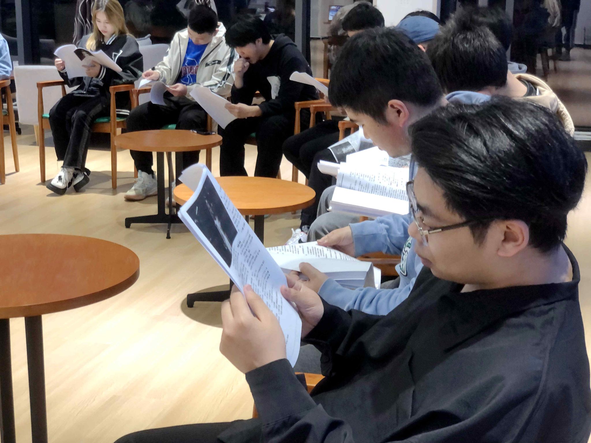 围读剧本,对编剧和导演把握剧本整体走向、改善剧本结构和打磨具体细节方面至关重要。活动中,参与的同学们按照角色分工,对剧本序幕及不同场景的内容进行围读表演。
