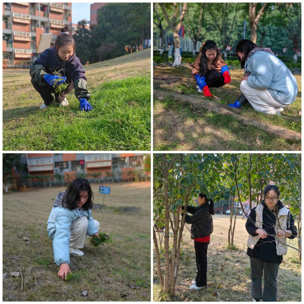 活动伊始,指导老师陈可老师从杂草类别、剪枝技巧以及安全防护等方面向同学们具体讲述了校园劳动的方式方法与注意事项。在陈老师的带领下,同学们两两组队,或带着剪刀沿途修剪树干上侧生的枝丫,或戴上防护手套满地找寻并拔除杂草。暖阳洒落,同学们纷纷化身劳动小能手,或在草坪上认真摸索,或在树林间来回穿梭,淡淡的青草香与泥土气息萦绕鼻尖,飞鸟掠过留下鸣声啼啼,在这热火朝天的劳动实践氛围中,大家共同努力谱写这部动听的劳动交响曲。