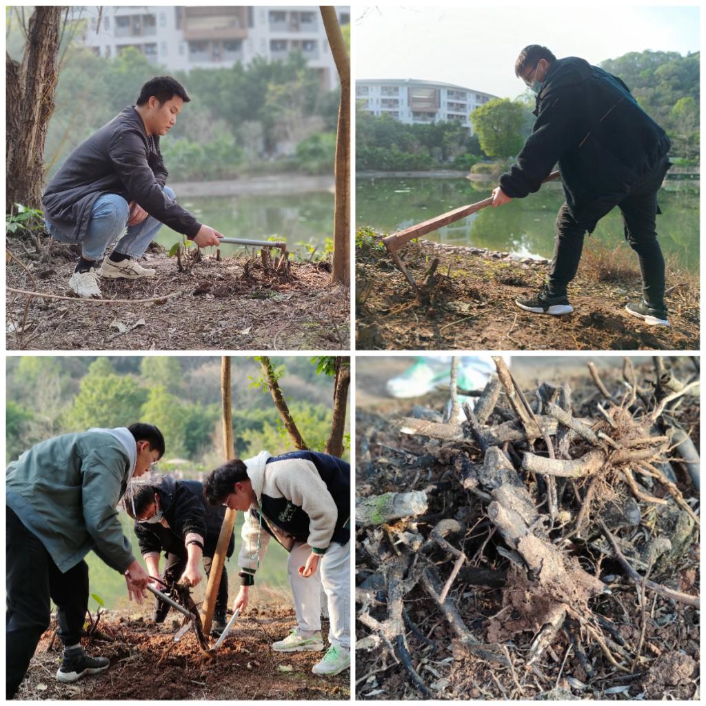 与此同时,苗木移栽小分队的劳动日常也在如火如荼的进行中。同学们跟随指导老师杨永生老师的步伐前往苗圃,仔细倾听种下一株树苗的步骤和注意事项。劳动过程中,小伙子们拿着大锄头、小铁锹唰唰开始干活。首先是刨除土壤里腐化的树根。大锄头一下一下重重砸进土里,已经变成黑棕色的树根随着锄头翻出渐渐显出原形,同学们合力用小铁锹砍断树根与土壤间的盘枝错节。紧接着是松土移栽,泥土纷飞,一个接一个树苗被种植在小花坛中,见证着校园劳动者们的辛勤足迹。