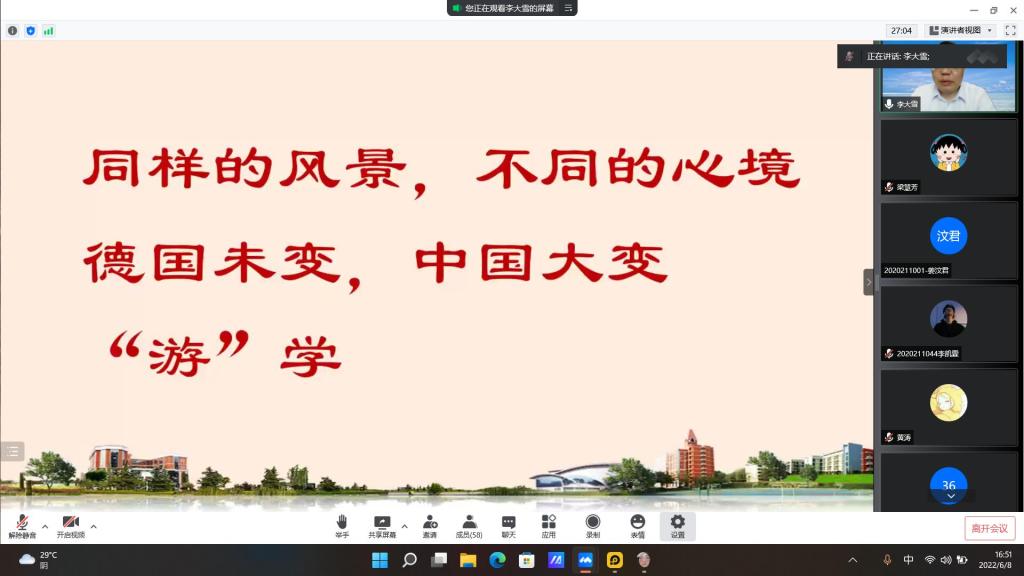 为拓宽书院学子国际视野、增进国际文化知识储备,6月8日下午,南湖书院名誉院长李大雪教授以“云游德国”为主题,以线上授课的形式开展了南湖书院第十九期名誉院长精品课。