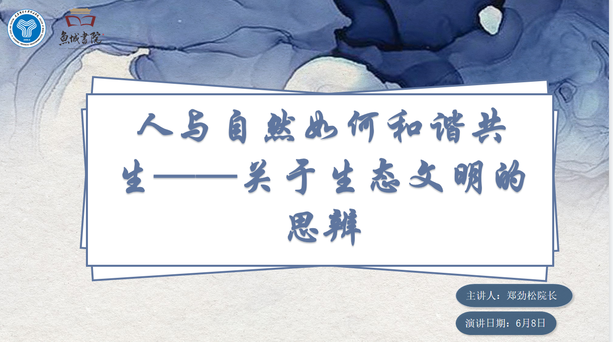 人与自然和谐共生,思辨鱼城伴你同行。2022年 6月8日,鱼城书院名誉院长郑劲松院长以《人与自然如何和谐共生——关于生态文明的思辨》为主题开展第二十二期院长精品课。在本期活动中,郑劲松院长主要从国家大政方针和群众身边改变两方面着手向同学们举例说明,通过对生态文明理念的深度解读与深刻剖析,向同学们传达正向的生态文明观念,倡导师生共同行动,做到人与自然和谐相处。本次活动应校园疫情防控要求,通过腾讯会议线上直播的形式进行。