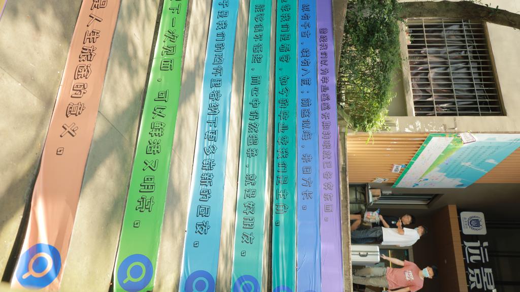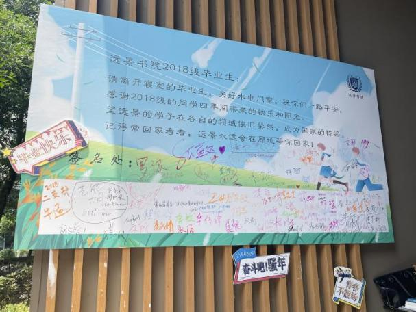 在远景门楼的阶梯上,贴满了对毕业生的祝福语。彩虹色的台阶,每一步都凝结着对他们的祝福,也寓意“步步高升,前程似锦。”登上台阶,挂着写给2018届学生的一封信,既是平常的话语,也是最后一次饱含温情的嘱托,是书院也是小家,是学子亦是亲人。