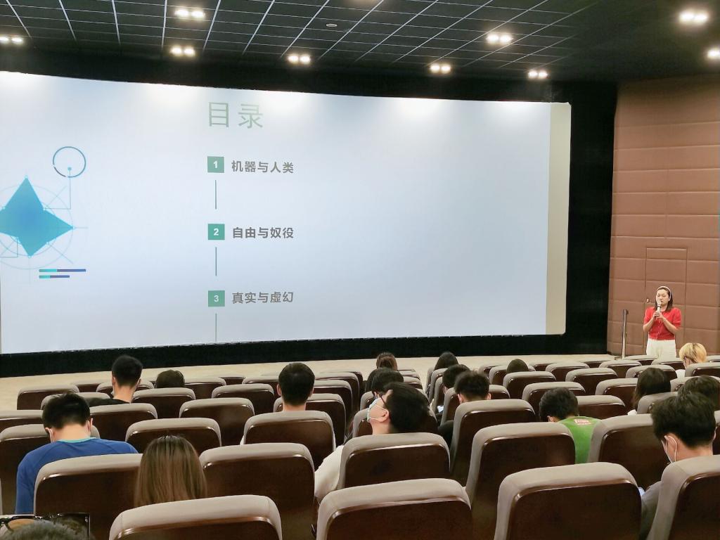 映后交流环节,陈霞老师从“机器与人类、自由与奴役、真实与虚幻”三个角度与同学们进行了交流分享,并推荐同学们拓展观看人工智能题材影片《她》与经典美剧《西部世界》,进一步思考未来世界中人类与人工智能的关系。最后,陈老师通过向同学们讲解诺奇克的“体验机”思想实验,引发同学们对影片中最核心主题“真实与虚拟”的思考,并呼吁同学们在日常学习生活中,要理性面对来自虚拟世界的诱惑,认真体味真实世界中的丰富情感。