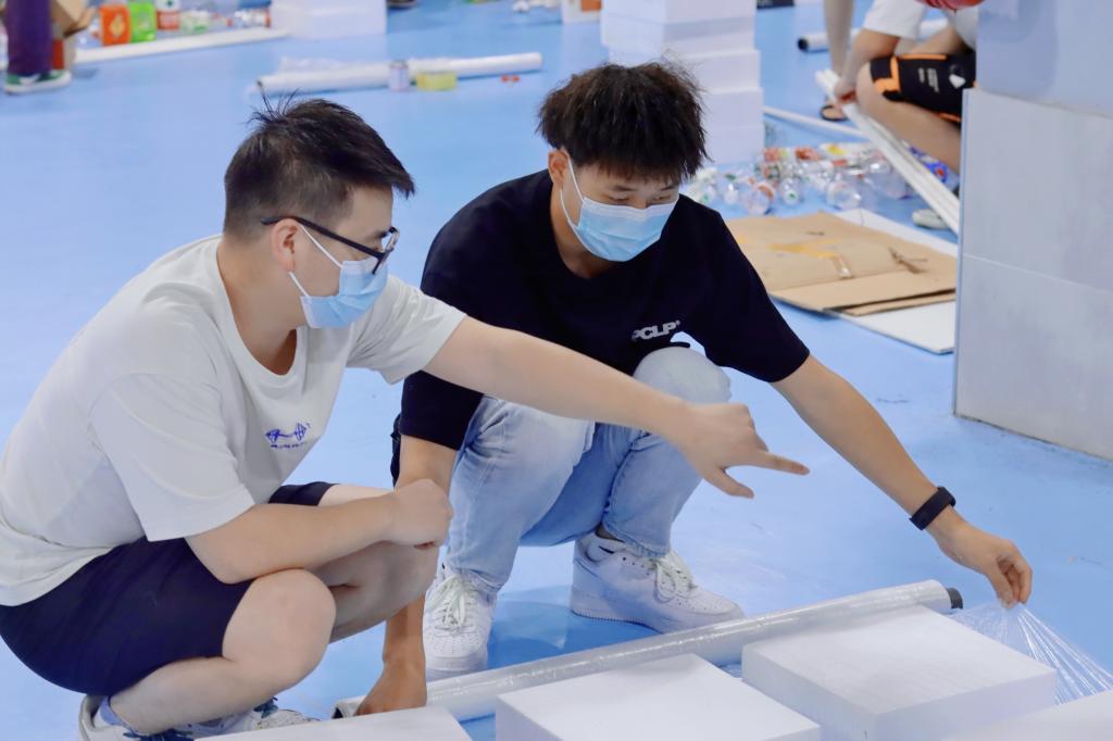 6月1日15:00,窗外小雨淅淅,汇江书院健身中心却热情洋溢。10支参赛队伍早早有序就位,根据收集到的废旧物资,同队的小伙伴们积极讨论着如何发挥创造力大展身手,完成小组的“战舰”。造船过程中,同学们的奇思妙想不断涌现,用矿泉水瓶和塑料水管搭建船只骨架,用泡沫板和KT版建造牢固的筏子……大家齐心协力,分工协作,相互配合默契,各类材料“变废为宝”,一艘艘形状各异、造型精美的“梦想小船”也初现雏形,造船环节接近尾声,同学们抓紧时间加固船只完善装饰,这一场创造思维的碰撞,更是书院学子朋辈互助的生动呈现。