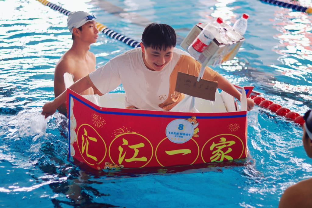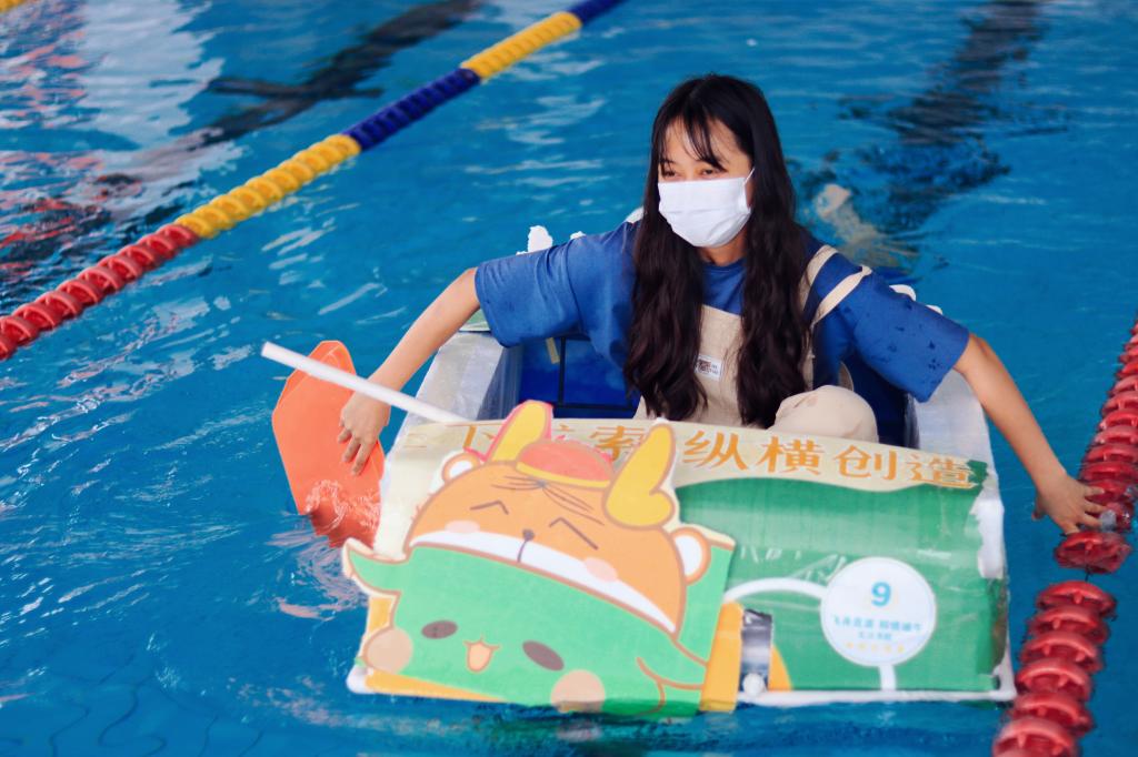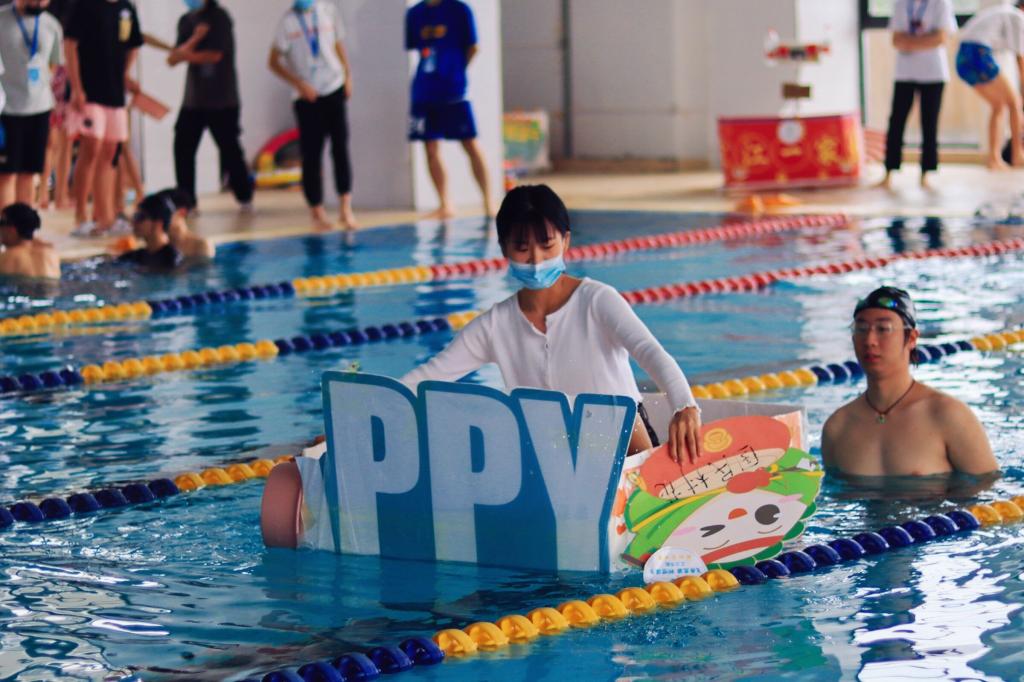 为保证参赛团队成员在比赛过程中的安全,来自校游泳队的同学们不仅在赛前指导安全知识,开展热身运动,还全程跟随参赛队员保护他们安全竞速。千帆竞渡,百舸争流。伴随着哨声响起,各组纷纷将船只放进游泳池,主持人一声令下,一场激烈的船舶竞速赛拉开了序幕。船上的参赛者们拼尽全力不甘落后,岸上的队友不住地高声呐喊,活动现场热闹非凡,看得人心潮澎湃。划船的同学,奋力向前,用尽全力把接力棒传递下去。途中有的队伍的船只不堪重负,队员只能俯卧靠手划船帮助小船前进,有的船只则十分坚固,载着队员们前行,乘风破浪。锣声响起,第一支队伍完成竞速。经过激烈地角逐,不仅决出了竞速前三名的队伍,一艘艘赢得“最具创意”、“最美船舶”奖项的船只也脱颖而出,掌声雷动中活动落下了帷幕,大家仍沉浸在欢乐之中,个个意犹未尽。