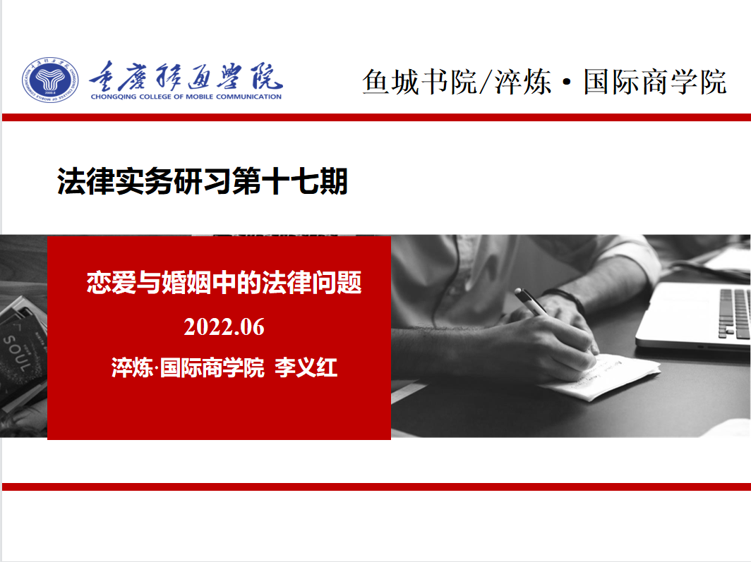 “家事”无小事,书院伴成长。2022年6月1日,鱼城书院学业导师李义红老师结合同学们当下与未来的实际需求和作为执业律师实践中的各种案例向同学们解读《恋爱与婚姻中的法律问题》。现场气氛活跃,师生互动热烈,再次让同学们体会到书院校园普法是真正接地气、近生活的普法教育。