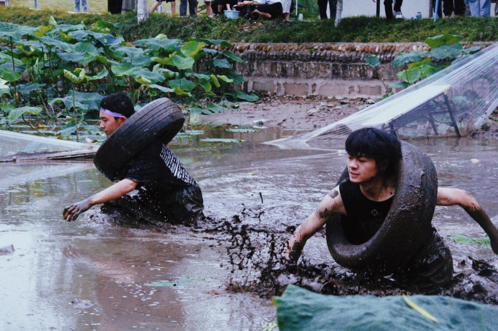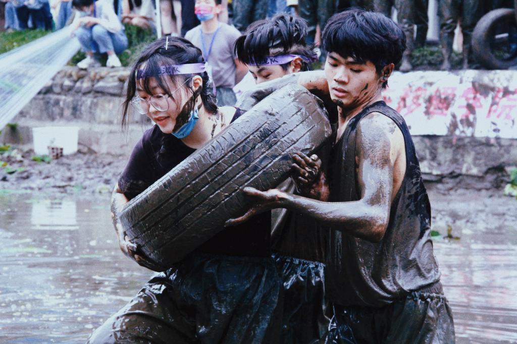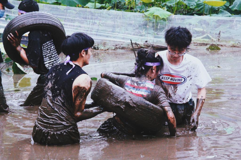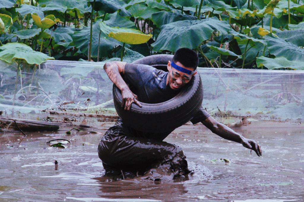 踏在泥上,肩扛重物,泥地里扛着轮胎前进真的好累,但是一个团队都在努力加快速度的时候真的好燃。那一刻我心里想的是我一定要走,我也必须得走,脚陷在泥里出不来,轮胎压的肩膀生疼,我咬起牙,狠下心,终于走向了终点。那一刻,我是兴奋的,是激昂的,感觉已经站在了人生巅峰!