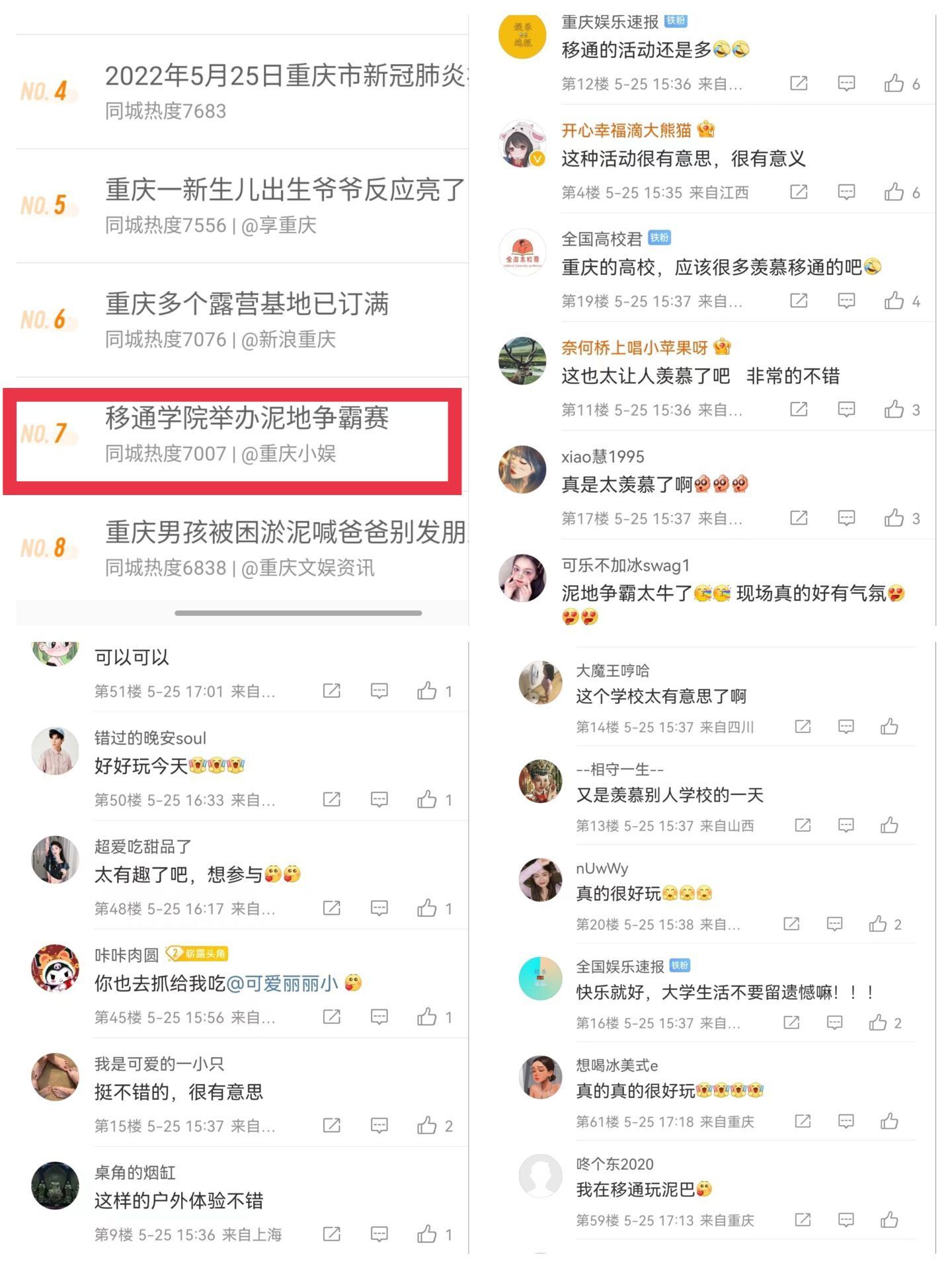 据悉,本次首届校园最强“零度”泥地挑战赛在当天引起了社会各界广泛关注和点赞,活动现场的盛况直冲微博同城热搜榜第七名,获得各大微博媒体相继转发报道和宣传,相关微博话题在3小时内获得100余万阅读和点击,重庆市内市外高校大学生在微博互动话题好评连连,社会各界给予移通学院书院制教育模式高度认可。