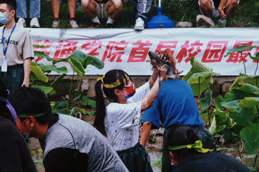各队伍在相应时间段内下水“摸鱼”,最终按照队伍“摸鱼”重量排名获得不同积分。参赛成员在泥地里围追堵截,合纵联横,一时间泥水四溅,喊声震天。顷刻间一个个泥人儿在场内换装而出,泥巴也遮不住他们明媚的脸庞,活动场里充斥着欢声笑语,张扬着青春活力,移通学子的激情在此刻尽情绽放。