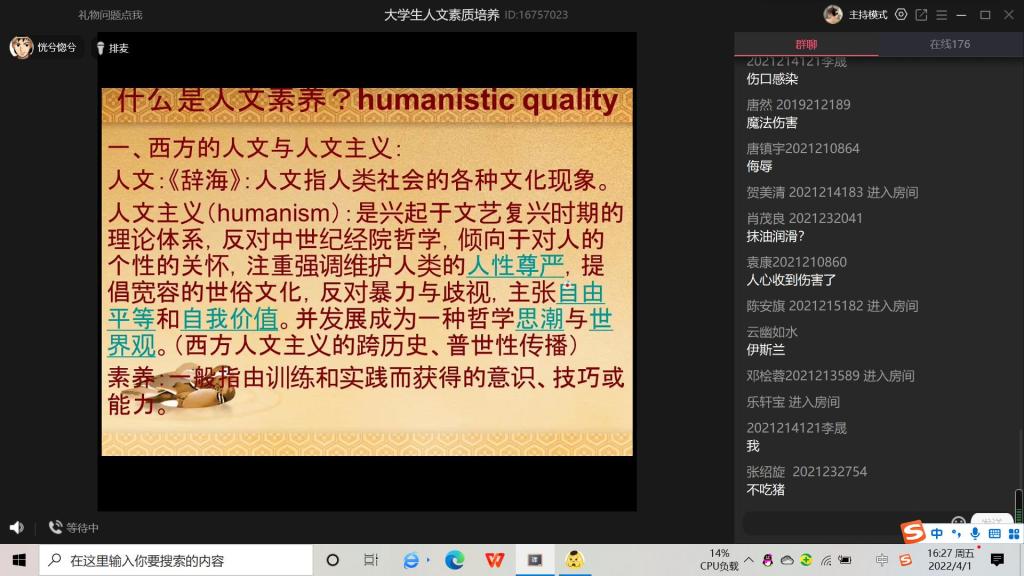 4月1日下午4点北山书院名誉院长王于飞教授以线上授课的形式进行了“大学生人文素质培养”为主题的精品授课,活动参与学生达到176人。本次活动通过人文与素质交流加强大学生的思想道德观,短短的80分钟,讨论高潮迭起,亦庄亦谐,舒畅无比。在活动中同学们进一步感受到人文素质教育的重要性,院长也将锻造乐学勤学的精神传播到此次授课的学生身上。