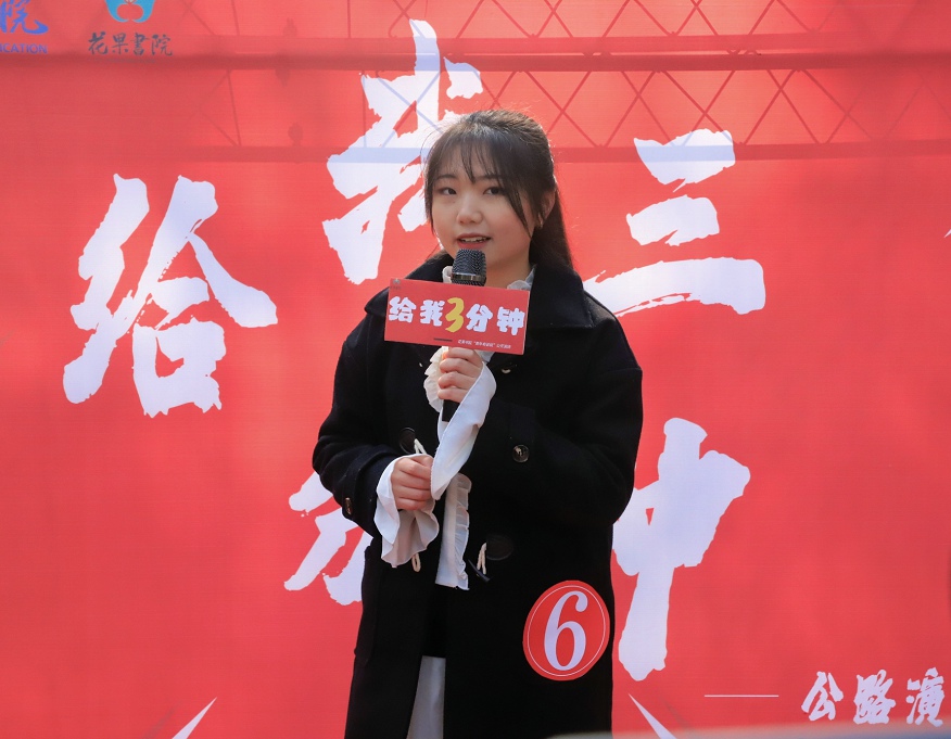“给我三分钟”公路演讲活动是花果书院围绕“感召力”打造的书院领导力常态化精品活动,旨在为同学们提供一个展示自我、锻炼口才、大胆发声、勇敢表达,从而提升自我感召力及个人魅力的舞台。引导广大学子既有破胆的勇气,更有感召的能力。鼓励广大学子勇于站在观众面前,用自己独特的人格魅力和演讲技巧向观众表达自己的所思所想。活动自2019年4月开展至今,累计开展18期,为百余名书院学子搭建了展现自我、挑战自我、超越自我的广阔平台,辐射人群近千人。