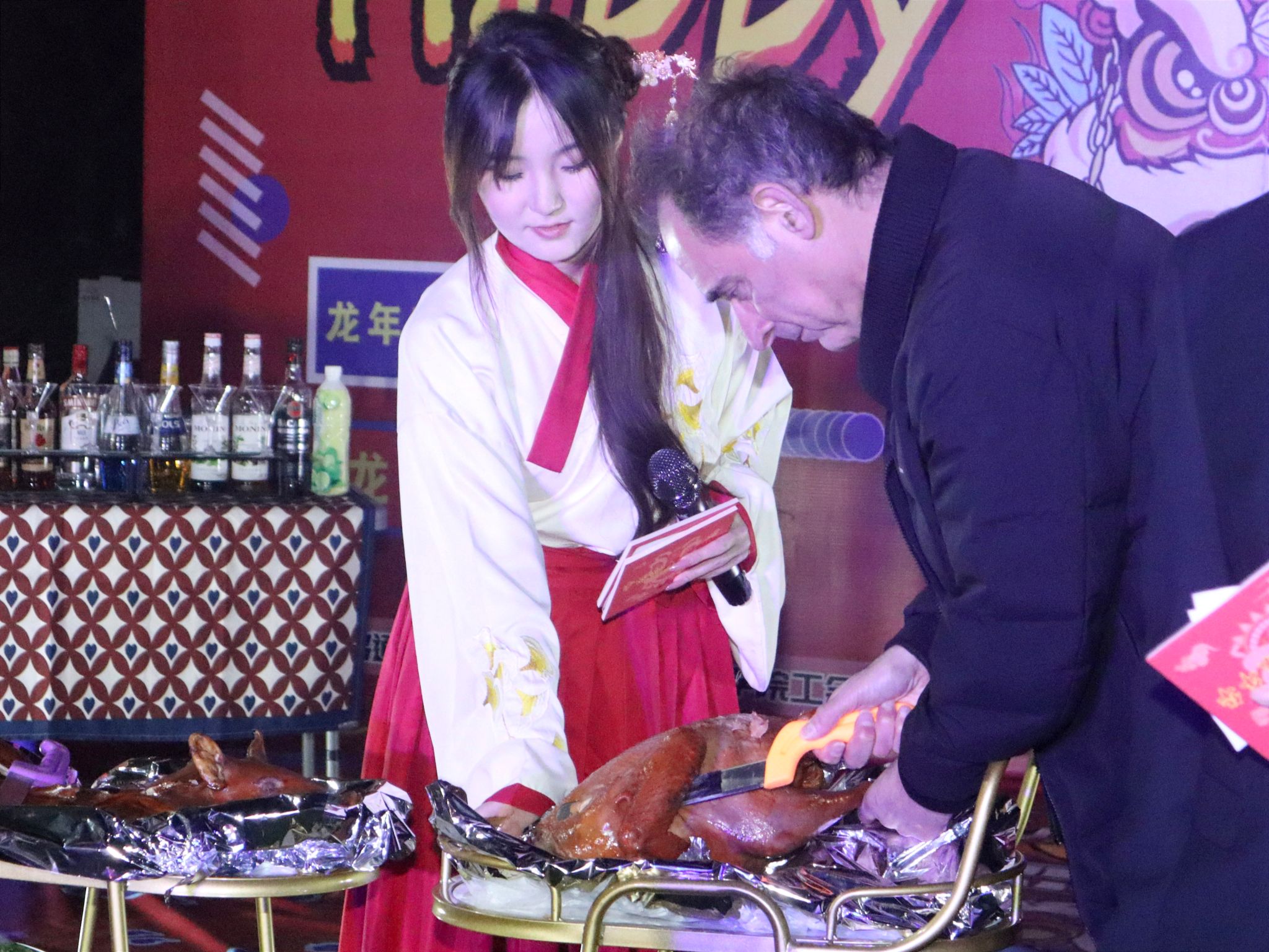 “金龙扭摆眉梢喜,狮子翻腾笑浪声” 年会通过铿锵的中国鼓曲正式开场,在瑞狮欢舞的演绎中,年会的序幕也就此拉开。年会的开始,变幻奇妙的川剧表演闪亮登场,在川剧老师变脸、喷火的精彩表演中,主会场的气氛来到第一个高潮,丰富多彩的年俗活动更加烘托出年的氛围,让每位参与者都能沉浸式感受到独属于中国传统文化的魅力。最浓的年味自然离不开热腾腾的烟火气,此次活动还特意为同学们准备了色香味俱全的“鸿运乳猪”以及在国外寓意着丰收、感恩的烤火鸡,在别具特色庆祝新年的美食中感受扑面而来的年味。同学们在主持人的邀请下一齐上台切开寓意鸿运和丰收的金猪和火鸡,师生于台上相互分享着对于美食的看法并互送新年的祝福,在不同文化的内涵以及文化的包容中,一起收获来自新年的美好寓意和祝福。