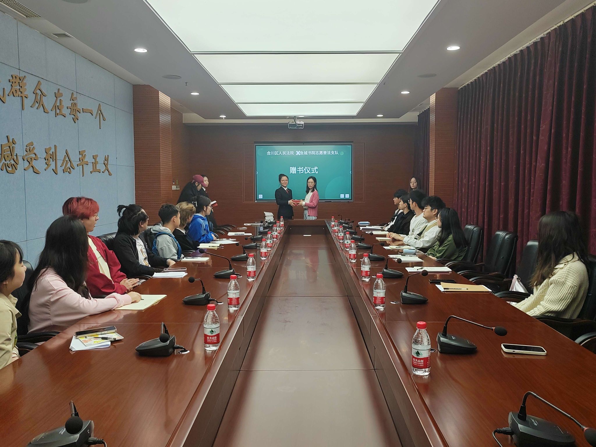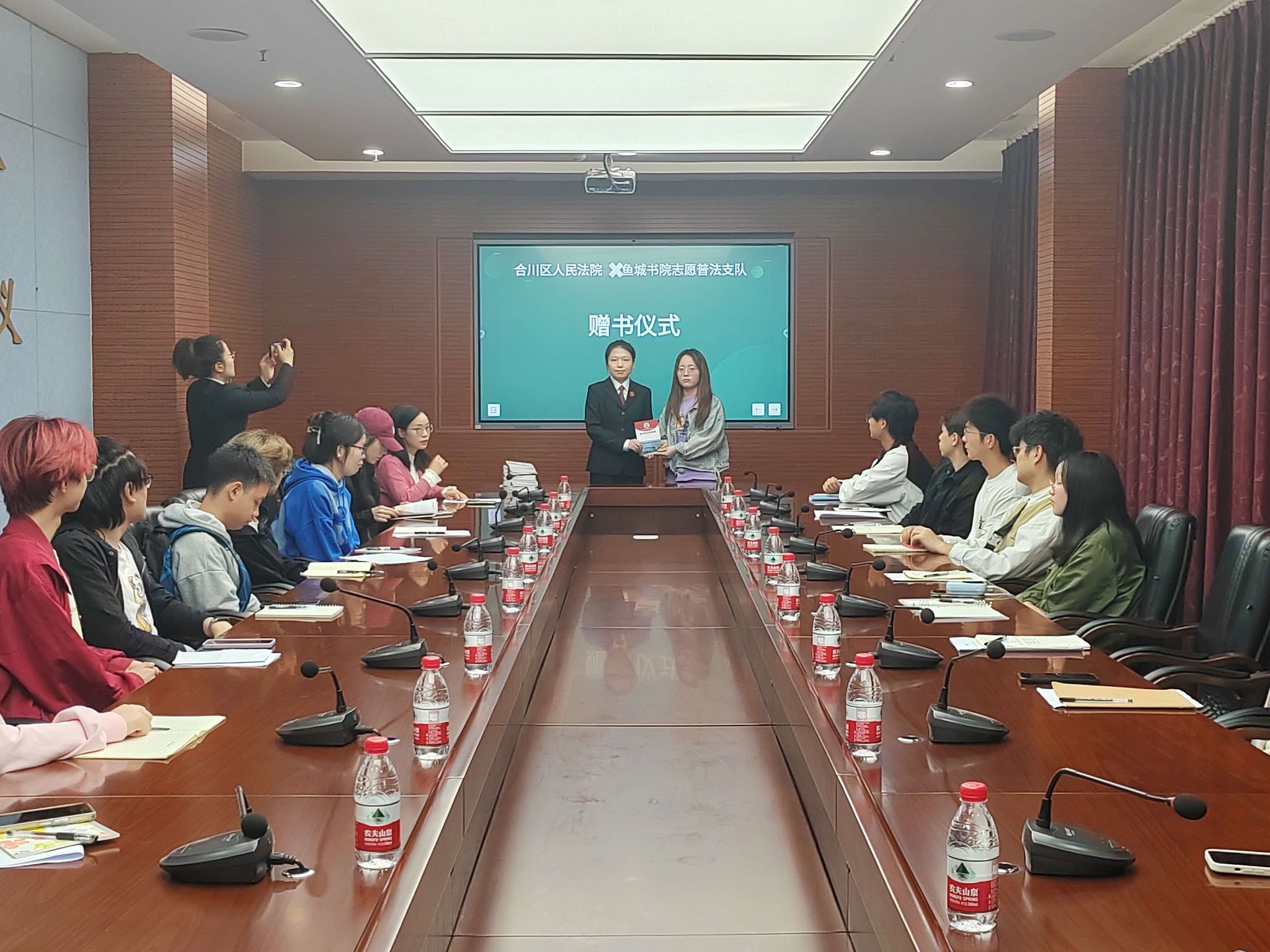 在交流环节,胡老师和谢书记结合自身工作经验和见闻,进一步鼓励和肯定大家积极参与普法志愿工作。随后何书记和谢书记将由合川法院撰写的《身边的法律故事》分别赠予胡老师和志愿者代表李倩同学,期望在未来的普法工作中继续深度链接,携手共进,推动校园和社会法治建设。