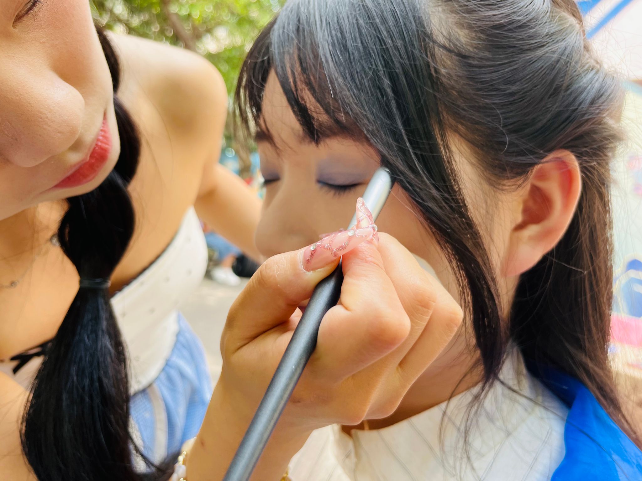 当妆容与艺术相遇,创意的火花便开始燃烧起来。随着比赛开始,参赛选手们迅速投入到妆造创作中,大家站在化妆镜前,就像变身成为了美妆魔法师一般,手中的化妆工具仿佛变成了魔法棒,在其巧手之下,一个个绚丽多彩的创意梦境逐渐呈现出来——眼影的渐变色彩宛如天边最绚烂的朝霞;口红的点缀则如同鲜艳的宝石般夺目;腮红的晕染更是巧妙地突出了参赛选手们的面部轮廓,使整个妆容更加立体和生动。书院学子们的作品仿佛是一幅幅流动的画卷,将古代妆容的精髓和魅力展现得淋漓尽致。从构思到实践,从选材到配色,每一个细节都充满了艺术的气息。妆点艺术,就是要把每一个元素都融入到妆容之中,让它们在脸上绽放出独特的光彩。