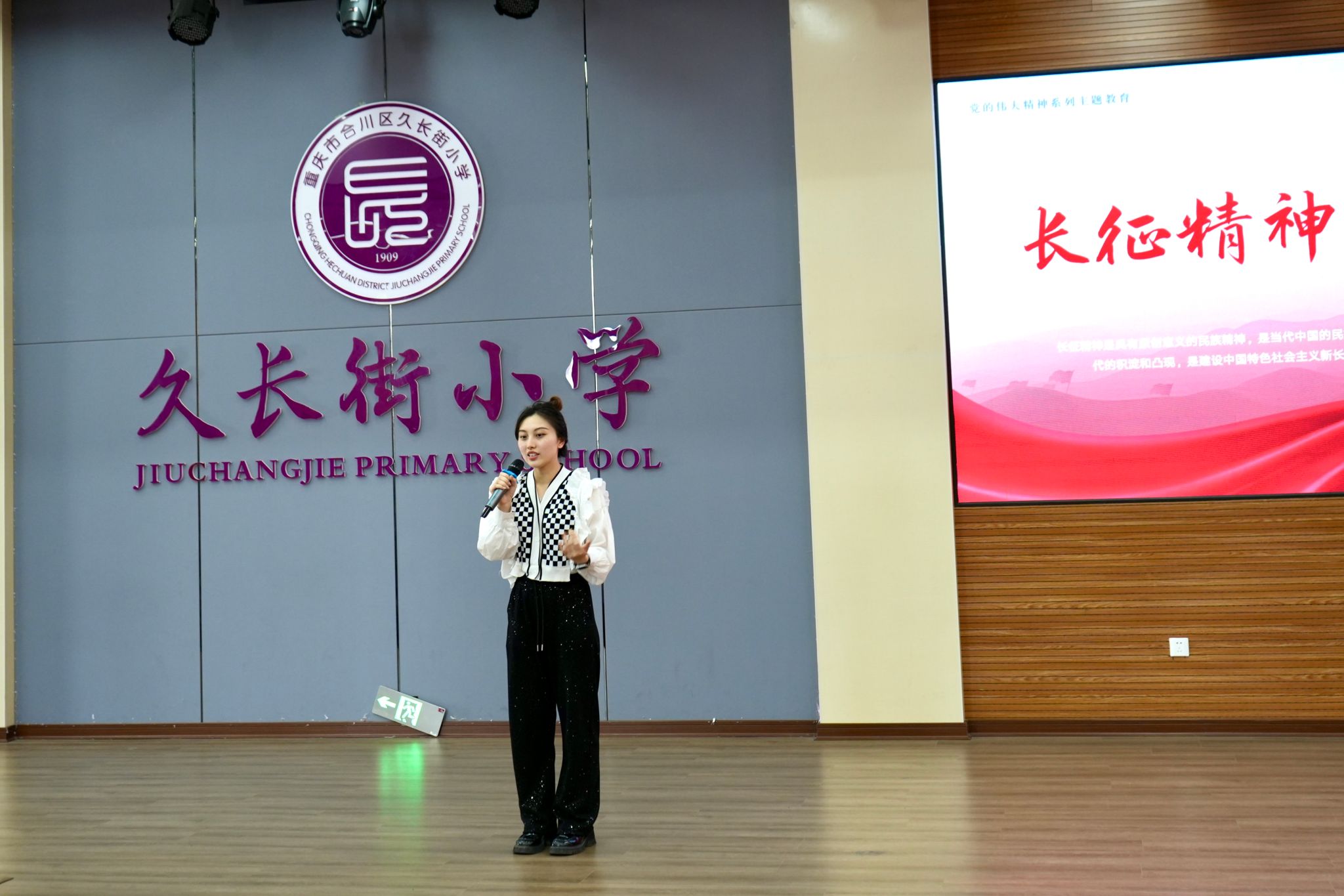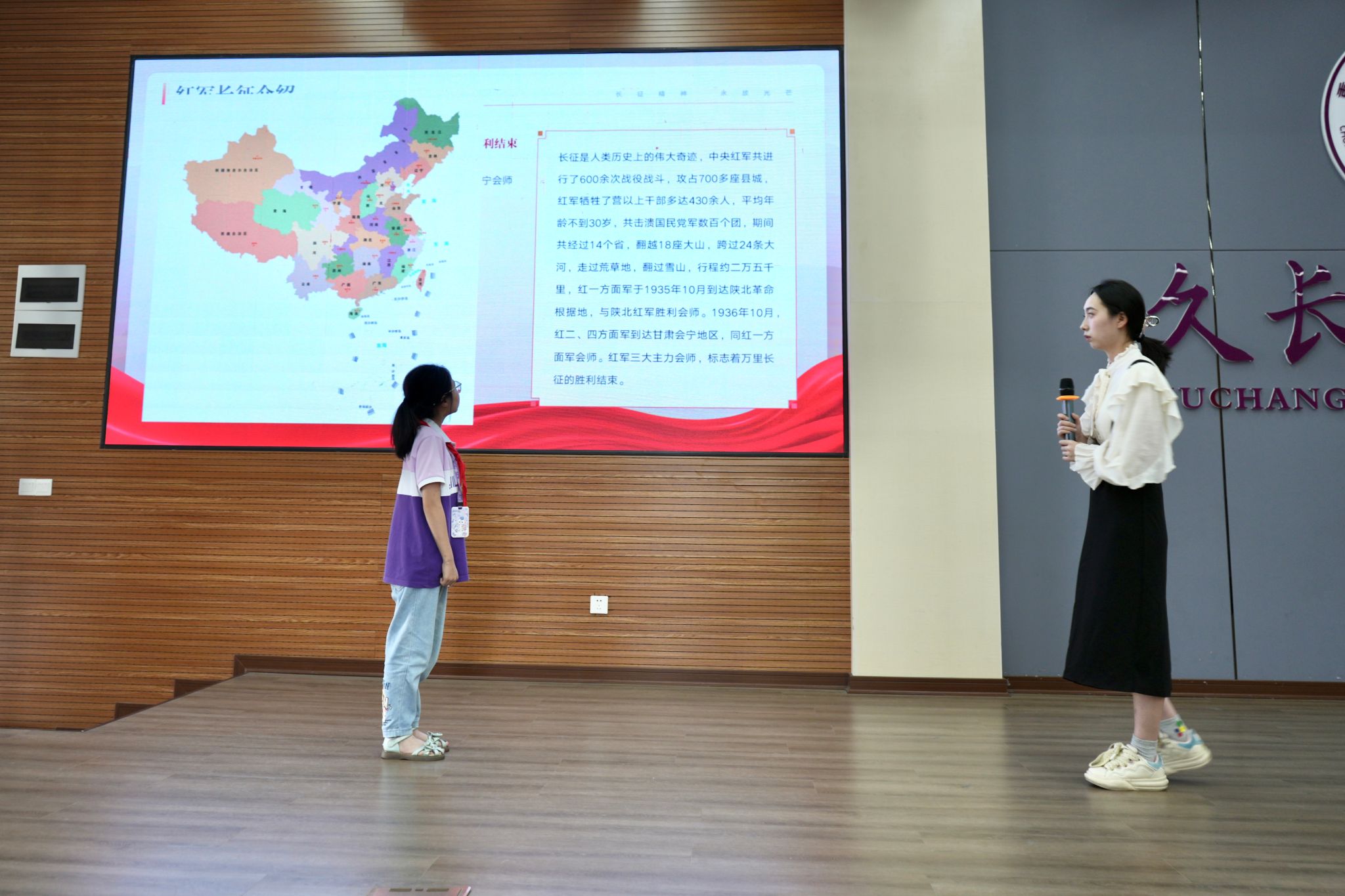 情景剧表演结束之后,通过大小学生同台朗诵环节,探索思政课堂多样性,切实发挥学生主体性作用,同时引导同学们产生共鸣和激情。紧接着,大学生由《沁园春·雪》的创作背景作为导入,抓住时代之问,为小学生们讲解了感人的长征故事,把故事“讲透”、把道理“讲深”,传递了长征精神。
