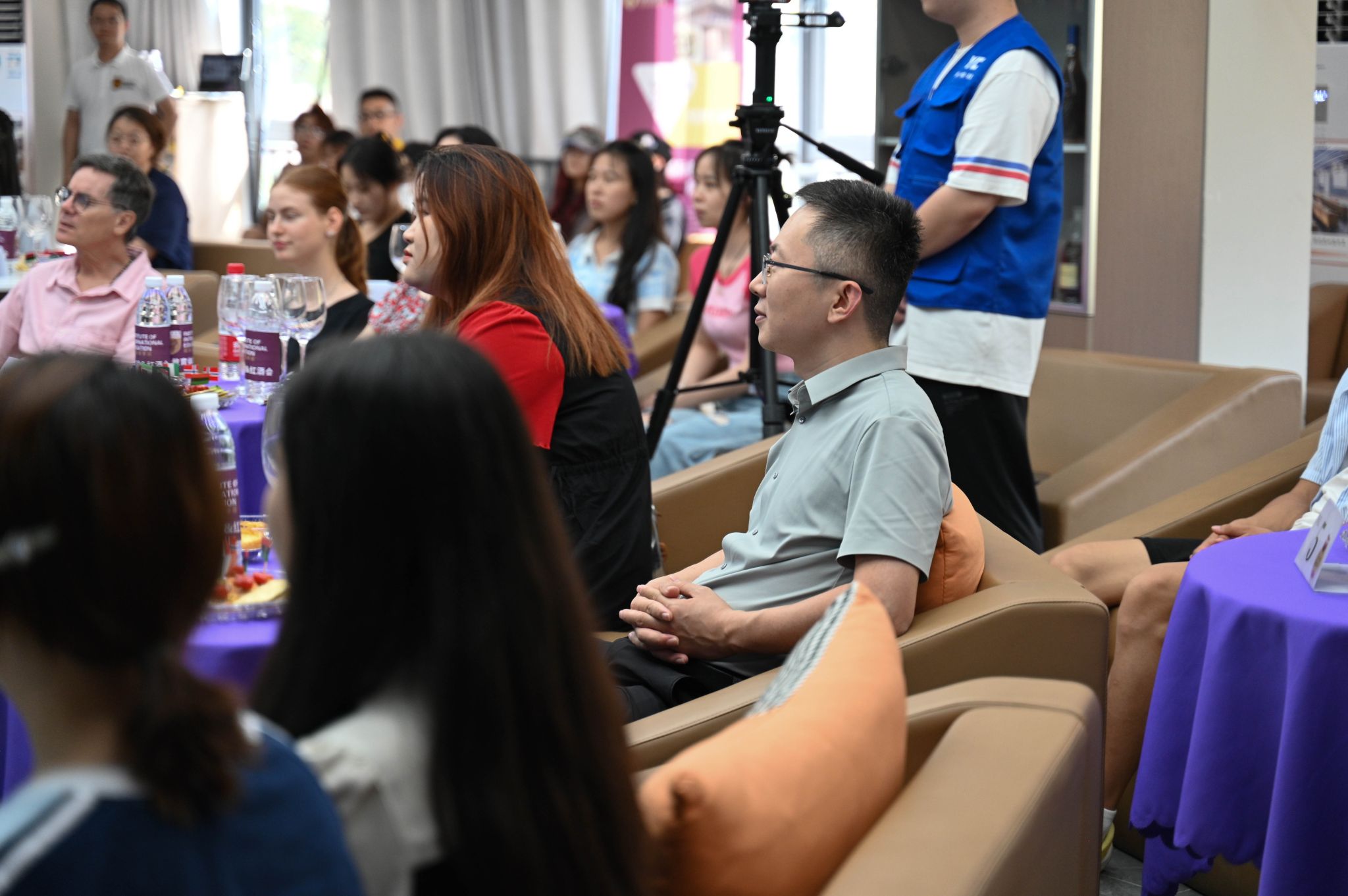 随后,资深红酒师江泽龙老师带领大家进入红酒品鉴环节,江老师以其专业的知识,风趣地为大家讲解酒品种类和品酒礼仪,引导大家深入了解红酒的魅力。师生们共持酒杯,细细品味来自世界各地的优质红酒,在觥筹交错中分享着彼此的故事与梦想,一声声:“Cheers!世界”的呼喊,是青山与你皆举杯的快意酣畅,也是满怀胜意同欢愉的翘首以待。