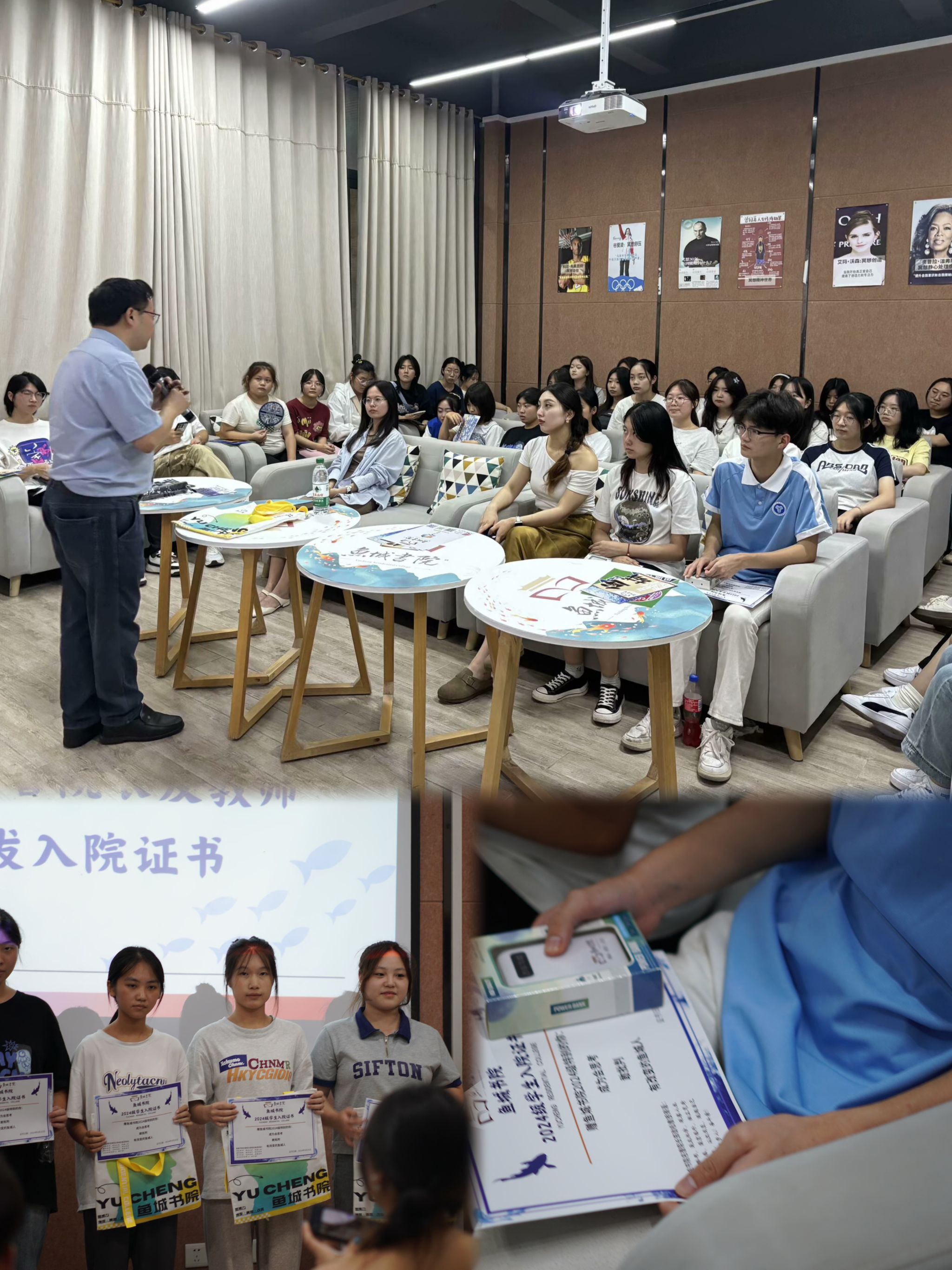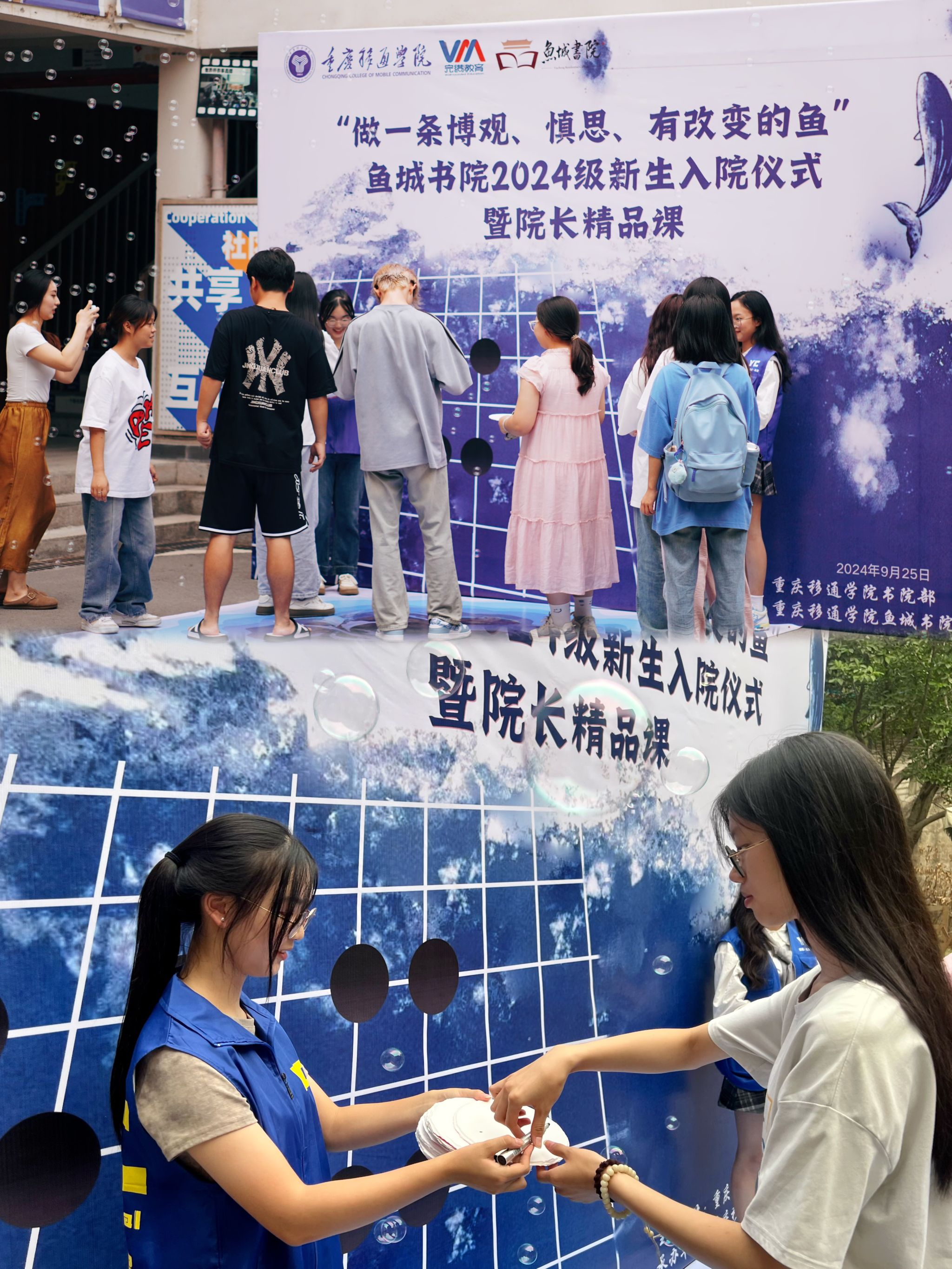 为使新生“鱼小思”们迅速熟悉书院环境、融入校园生活,提升集体认同感与归属感。鱼城书院于2024年9月25日下午,在空格影音室开展了以“做一条博观、慎思、有改变的鱼”为主题的2024级新生入院仪式暨院长精品课。本次入院仪式通过“众川赴海,特色签到”、“殷殷嘱托,师长谈成长”、“ 倾心以付,学姐递心得”、“亲历进步,开启新未来”、“释疑启智,院长引前路”等多个环节为鱼城书院新生营造独特的仪式感。本次入院仪式先由鱼城书院学生发展导师杨钊熙老师与赵晨老师为新生代表颁发了个性的入院证书、独特的书院文创周边。接着邀请优秀学姐黄紫悦以分享德国游学为切入点讲述她的完满故事,通过自身经历告诉新生们要把握每一次参与活动的机会,学会借用书院的平台展现自己。名誉院长郑劲松教授结合合川本地著名爱国实业家、教育家卢作孚先生的经历勉励大家要善于思辨、勇于改变,在这个工具改变人的新时代,我们的思维就是工具,思维也能改变一切,最后祝愿大家能在书院开启完满人生的新篇章。