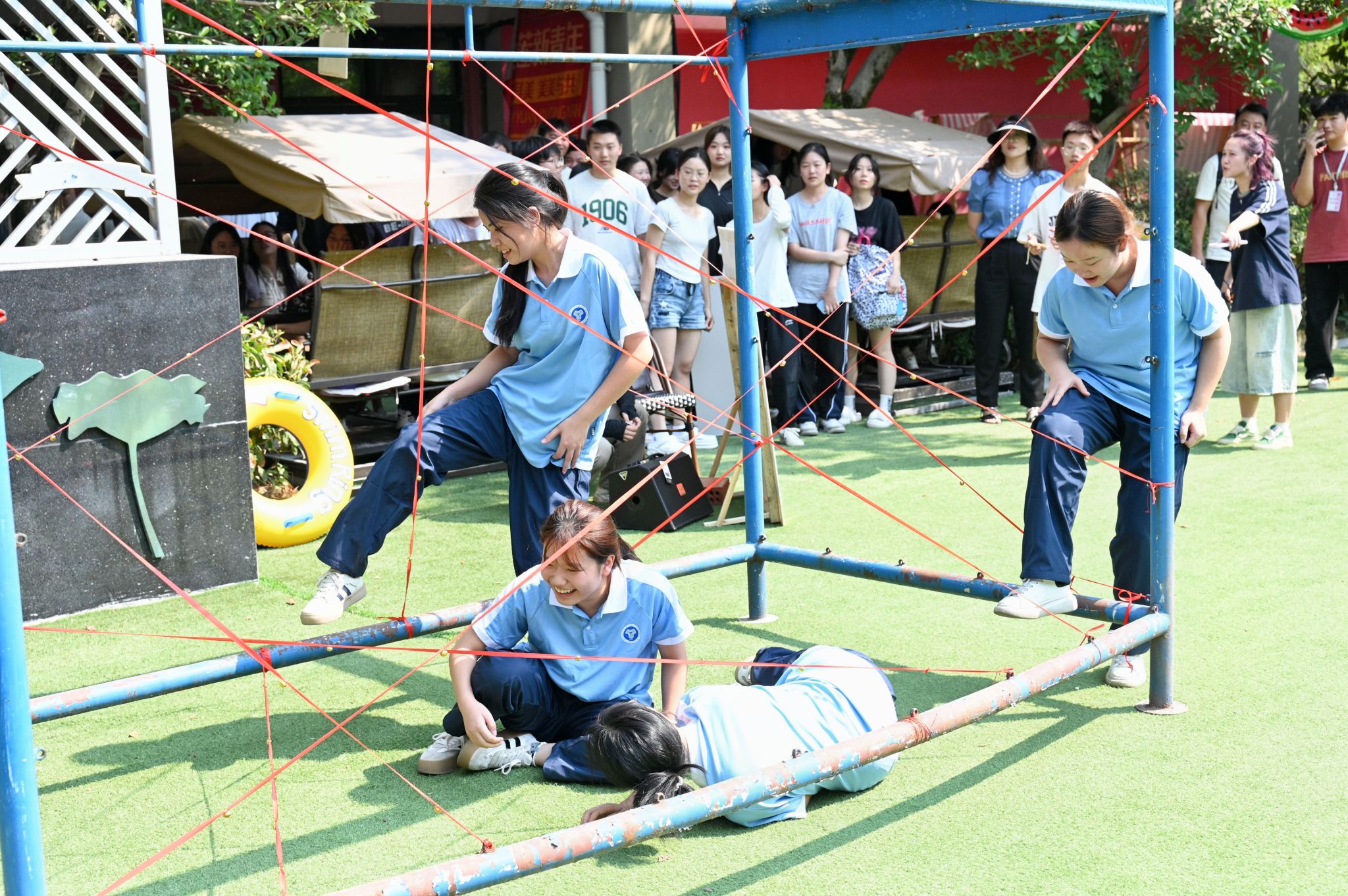 一声哨音响起,学生们以团队出发,在丝线密网间穿梭,绕过重重障碍,闯过设计巧妙的复杂关卡。随着比赛进入最后的冲刺阶段,各团队成员的心跳加速,他们的脚步变得更加急促。在观众的尖叫声中,团队6人一起握紧木槌,重重地敲响了铜锣,清脆的锣声响彻云霄,胜利的喜悦在他们的脸上绽放。最终男生和女生队伍各有三组队伍脱颖而出,其中,天霸动霸tua队伍以5分55秒的惊人成绩,获得本季闯关王的称号。他们的胜利不仅是速度与技巧的展现,更是团队协作精神的最佳诠释。