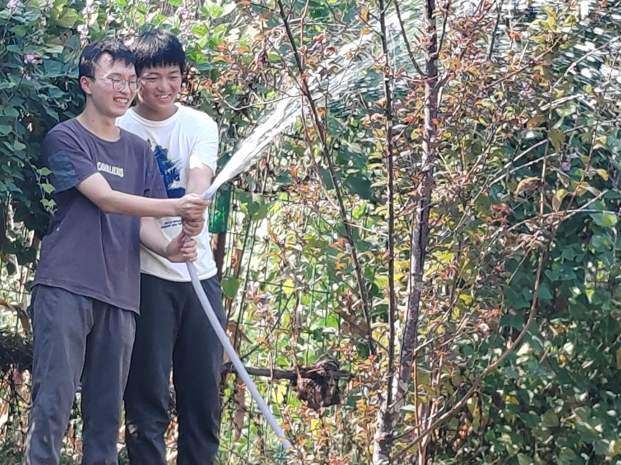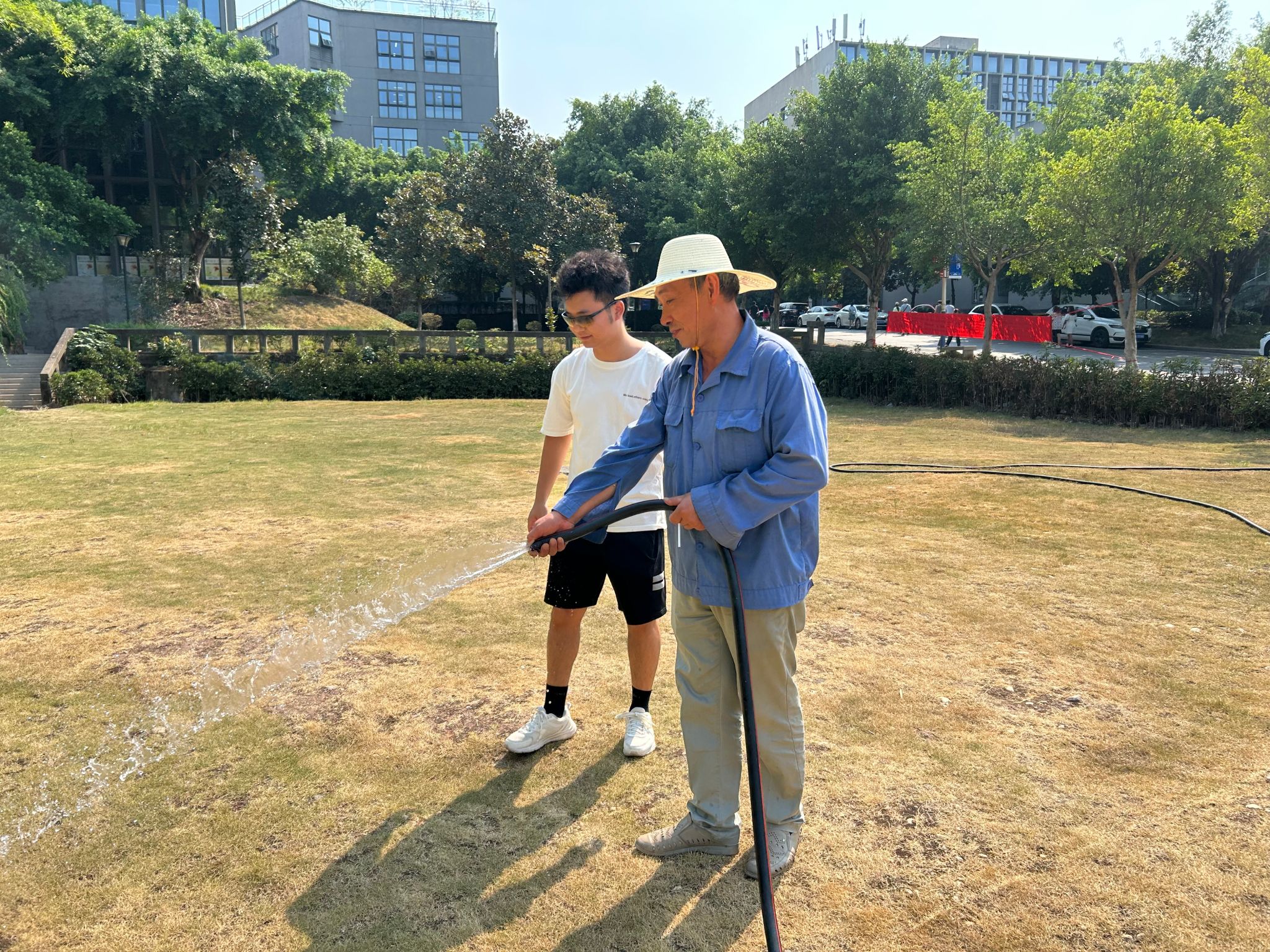 劳动技术指导老师陈家银老师针对秋季干燥的气候特点向同学们介绍了“不干不浇,浇则浇透”的草地维护原则与注意事项。随后,在老师的帮助下同学们三两组队,分工明确,完成了双子湖、南湖书院等区域的手动浇水工作,呈现出一幅热火朝天的劳动画面。随着水慢慢地渗入泥土中,空气里渐渐散发出泥土的芬芳,绿化养护工作对于同学们来说不仅仅是一项体力活,亦是一场身体力行美化校园环境、感知自然魅力的焕新之行。